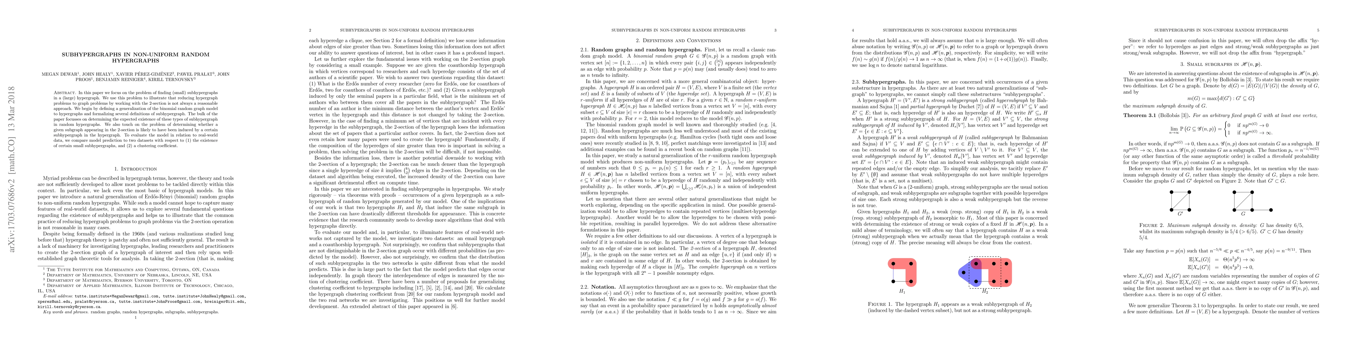 This paper investigates the existence of small subhypergraphs in large non-uniform random hypergraphs, demonstrating that reducing hypergraph problems to graph problems via the 2-section is not always valid. It evaluates a model against real-world datasets for predicting subhypergraph presence and clustering coefficients.
