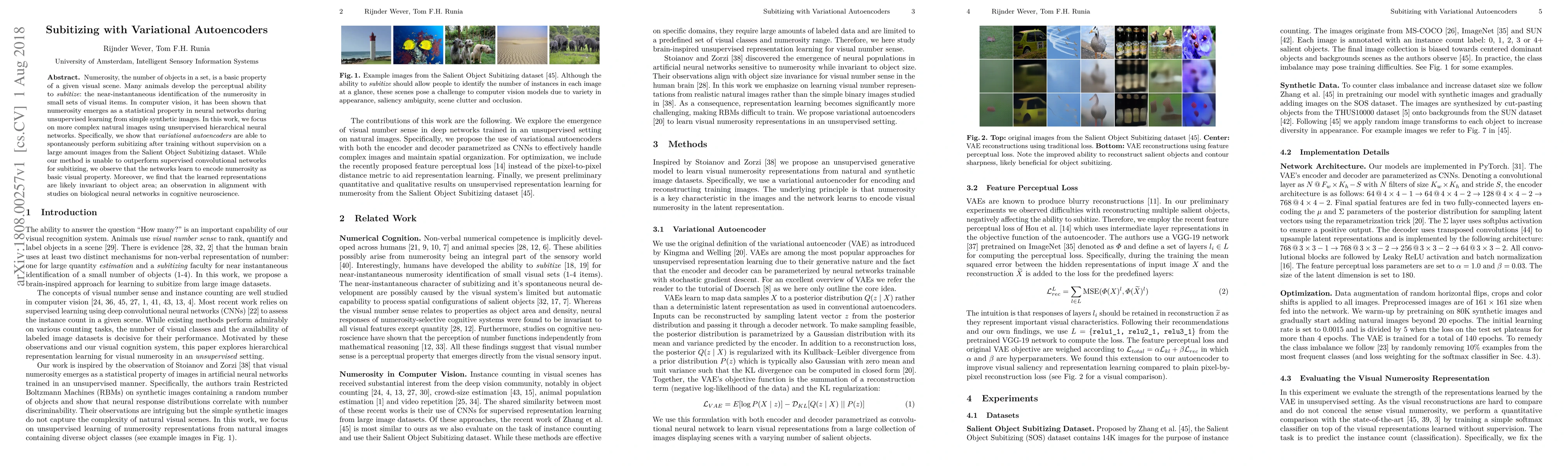 Numerosity, the number of objects in a set, is a basic property of a given visual scene. Many animals develop the perceptual ability to subitize: the near-instantaneous identification of the numerosity in small sets of visual items. In computer vision, it has been shown that numerosity emerges as a statistical property in neural networks during unsupervised learning from simple synthetic images. In this work, we focus on more complex natural images using unsupervised hierarchical neural networks. Specifically, we show that variational autoencoders are able to spontaneously perform subitizing after training without supervision on a large amount images from the Salient Object Subitizing dataset. While our method is unable to outperform supervised convolutional networks for subitizing, we observe that the networks learn to encode numerosity as basic visual property. Moreover, we find that the learned representations are likely invariant to object area; an observation in alignment with studies on biological neural networks in cognitive neuroscience.