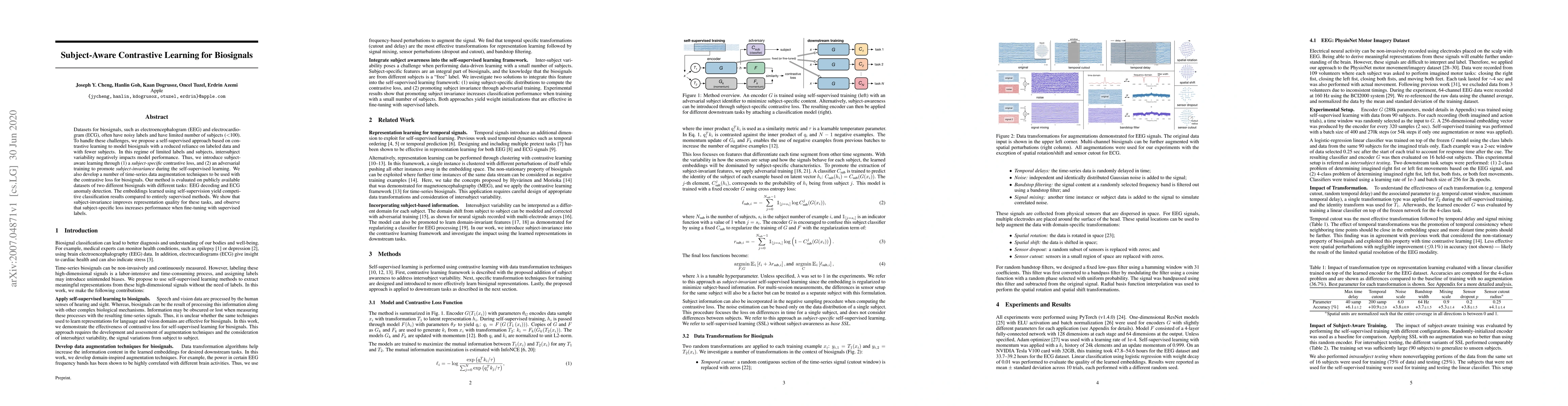 Researchers propose a self-supervised approach to modeling biosignals like EEG and ECG using contrastive learning, overcoming challenges of noisy labels and limited subjects. Their method yields competitive classification results and shows that subject-aware loss improves representation quality.