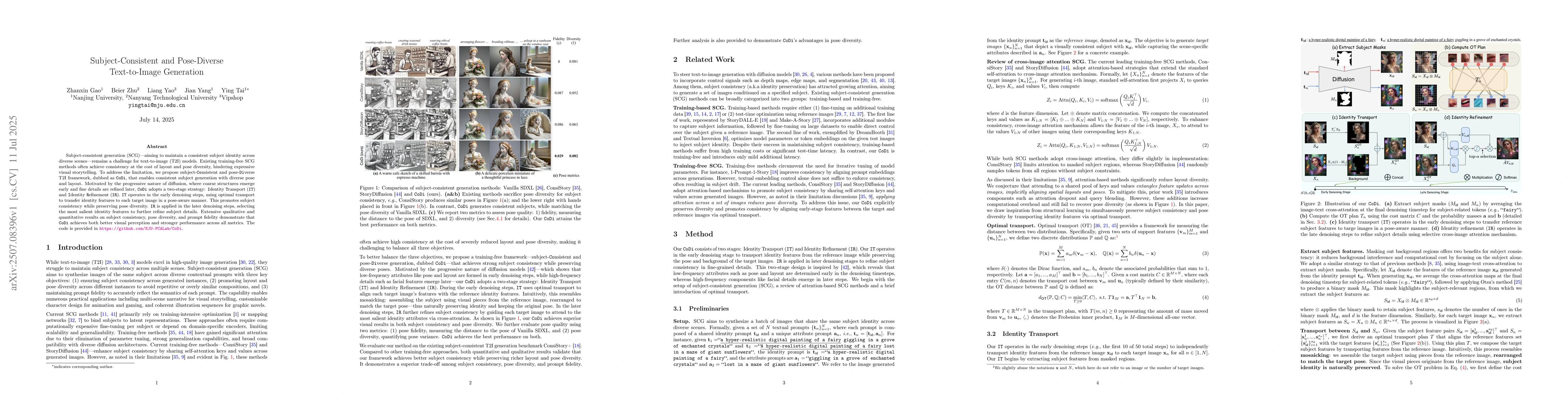 Subject-consistent generation (SCG)-aiming to maintain a consistent subject identity across diverse scenes-remains a challenge for text-to-image (T2I) models. Existing training-free SCG methods often achieve consistency at the cost of layout and pose diversity, hindering expressive visual storytelling. To address the limitation, we propose subject-Consistent and pose-Diverse T2I framework, dubbed as CoDi, that enables consistent subject generation with diverse pose and layout. Motivated by the progressive nature of diffusion, where coarse structures emerge early and fine details are refined later, CoDi adopts a two-stage strategy: Identity Transport (IT) and Identity Refinement (IR). IT operates in the early denoising steps, using optimal transport to transfer identity features to each target image in a pose-aware manner. This promotes subject consistency while preserving pose diversity. IR is applied in the later denoising steps, selecting the most salient identity features to further refine subject details. Extensive qualitative and quantitative results on subject consistency, pose diversity, and prompt fidelity demonstrate that CoDi achieves both better visual perception and stronger performance across all metrics. The code is provided in https://github.com/NJU-PCALab/CoDi.
