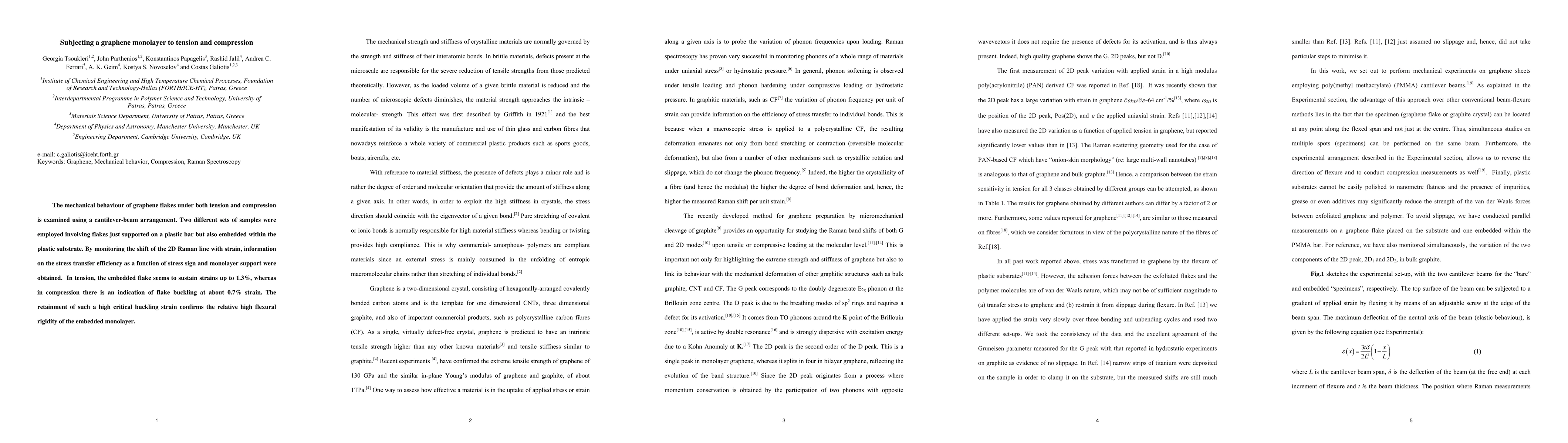 The mechanical behaviour of graphene flakes under both tension and compression is examined using a cantilever-beam arrangement. Two different sets of samples were employed involving flakes just supported on a plastic bar but also embedded within the plastic substrate. By monitoring the shift of the 2D Raman line with strain, information on the stress transfer efficiency as a function of stress sign and monolayer support were obtained. In tension, the embedded flake seems to sustain strains up to 1.3%, whereas in compression there is an indication of flake buckling at about 0.7% strain. The retainment of such a high critical buckling strain confirms the relative high flexural rigidity of the embedded monolayer.