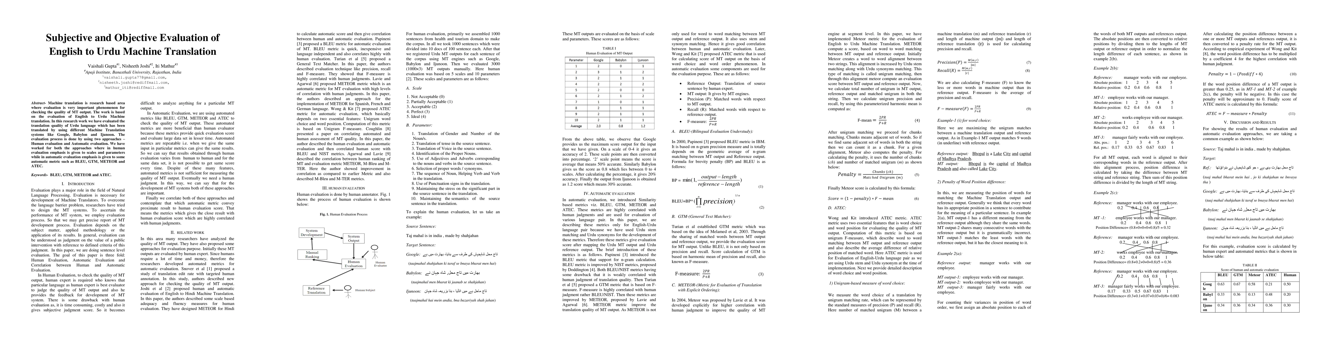 This research evaluates the quality of English to Urdu machine translation using both human and automatic evaluation methods, comparing outputs from Google, Babylon, and Ijunoon. The study employs scales and parameters for human assessment and metrics like BLEU, GTM, METEOR, and ATEC for automatic evaluation.