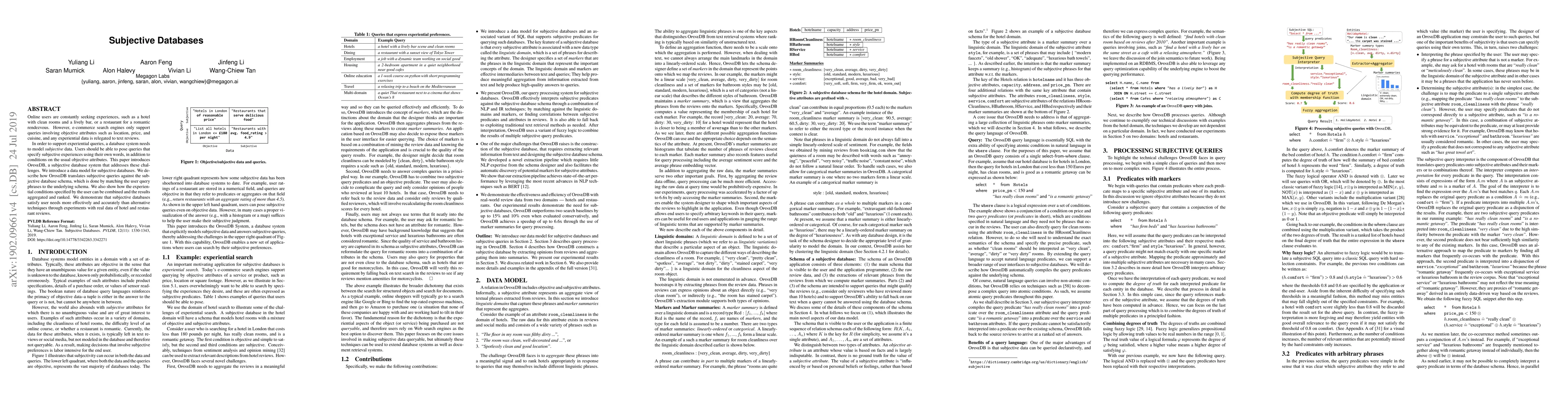 This paper introduces Opine, a subjective database system designed to model and query experiential data, such as user reviews, alongside objective attributes. It demonstrates improved effectiveness in handling experiential queries compared to traditional e-commerce search engines.
