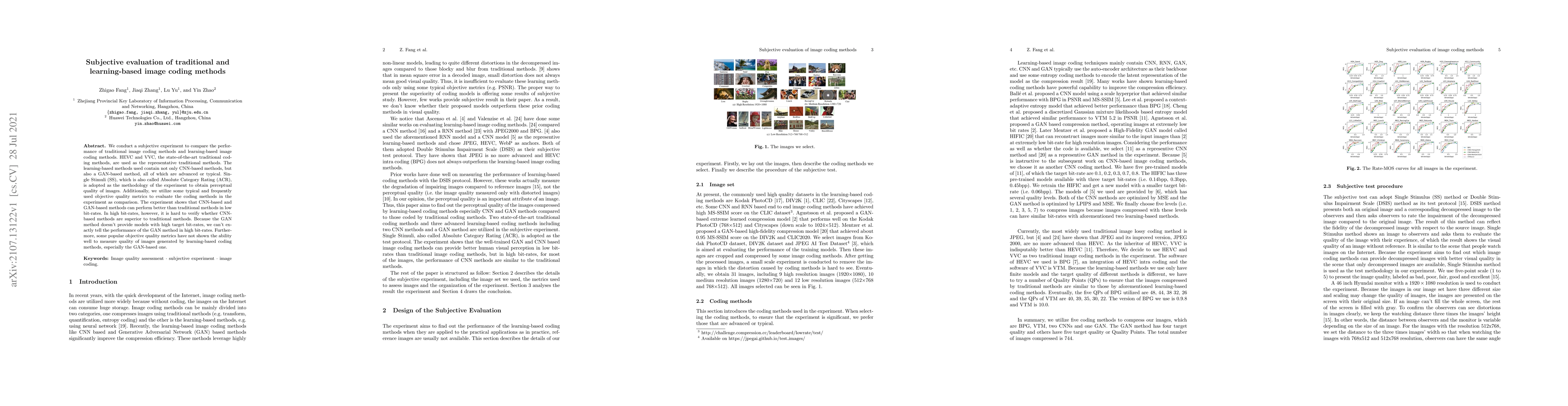 We conduct a subjective experiment to compare the performance of traditional image coding methods and learning-based image coding methods. HEVC and VVC, the state-of-the-art traditional coding methods, are used as the representative traditional methods. The learning-based methods used contain not only CNN-based methods, but also a GAN-based method, all of which are advanced or typical. Single Stimuli (SS), which is also called Absolute Category Rating (ACR), is adopted as the methodology of the experiment to obtain perceptual quality of images. Additionally, we utilize some typical and frequently used objective quality metrics to evaluate the coding methods in the experiment as comparison. The experiment shows that CNN-based and GAN-based methods can perform better than traditional methods in low bit-rates. In high bit-rates, however, it is hard to verify whether CNN-based methods are superior to traditional methods. Because the GAN method does not provide models with high target bit-rates, we cannot exactly tell the performance of the GAN method in high bit-rates. Furthermore, some popular objective quality metrics have not shown the ability well to measure quality of images generated by learning-based coding methods, especially the GAN-based one.