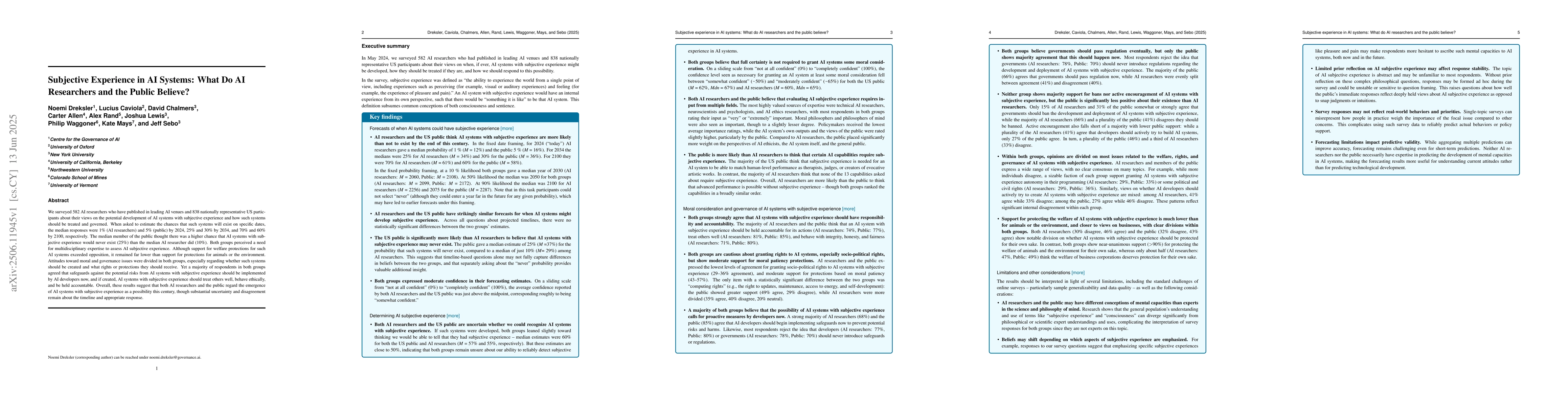 We surveyed 582 AI researchers who have published in leading AI venues and 838 nationally representative US participants about their views on the potential development of AI systems with subjective experience and how such systems should be treated and governed. When asked to estimate the chances that such systems will exist on specific dates, the median responses were 1% (AI researchers) and 5% (public) by 2024, 25% and 30% by 2034, and 70% and 60% by 2100, respectively. The median member of the public thought there was a higher chance that AI systems with subjective experience would never exist (25%) than the median AI researcher did (10%). Both groups perceived a need for multidisciplinary expertise to assess AI subjective experience. Although support for welfare protections for such AI systems exceeded opposition, it remained far lower than support for protections for animals or the environment. Attitudes toward moral and governance issues were divided in both groups, especially regarding whether such systems should be created and what rights or protections they should receive. Yet a majority of respondents in both groups agreed that safeguards against the potential risks from AI systems with subjective experience should be implemented by AI developers now, and if created, AI systems with subjective experience should treat others well, behave ethically, and be held accountable. Overall, these results suggest that both AI researchers and the public regard the emergence of AI systems with subjective experience as a possibility this century, though substantial uncertainty and disagreement remain about the timeline and appropriate response.