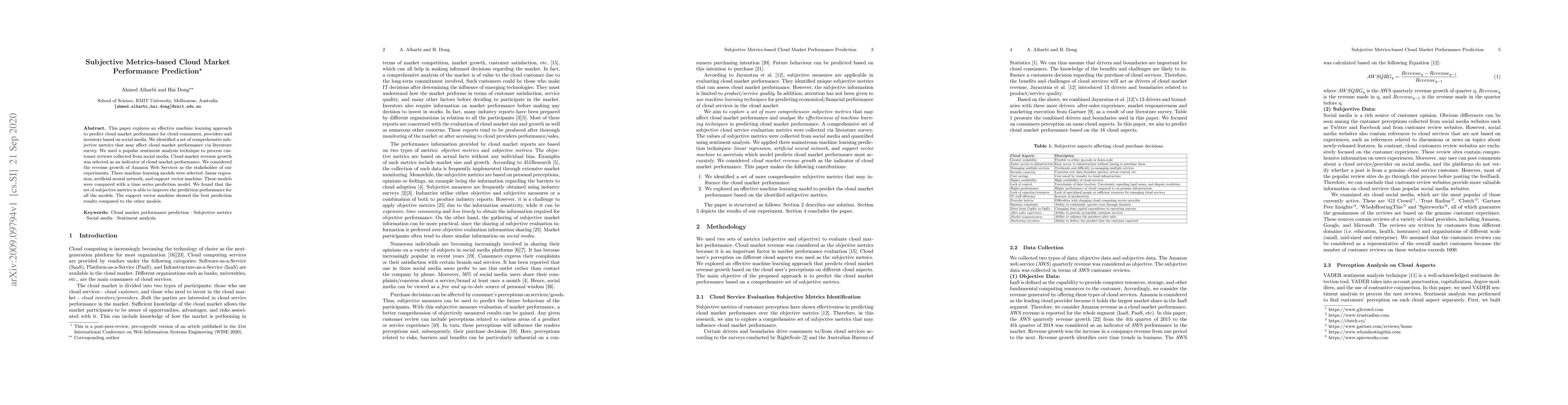 This paper proposes a machine learning method to predict cloud market performance using social media sentiment analysis and subjective metrics. The support vector machine model outperformed others, indicating that subjective metrics enhance prediction accuracy.