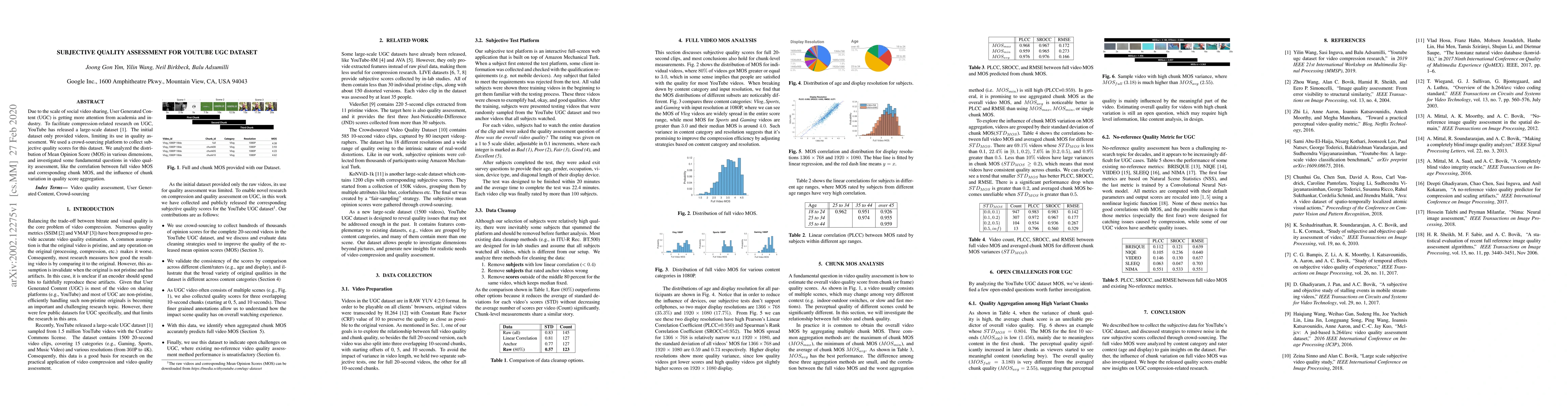Due to the scale of social video sharing, User Generated Content (UGC) is getting more attention from academia and industry. To facilitate compression-related research on UGC, YouTube has released a large-scale dataset. The initial dataset only provided videos, limiting its use in quality assessment. We used a crowd-sourcing platform to collect subjective quality scores for this dataset. We analyzed the distribution of Mean Opinion Score (MOS) in various dimensions, and investigated some fundamental questions in video quality assessment, like the correlation between full video MOS and corresponding chunk MOS, and the influence of chunk variation in quality score aggregation.