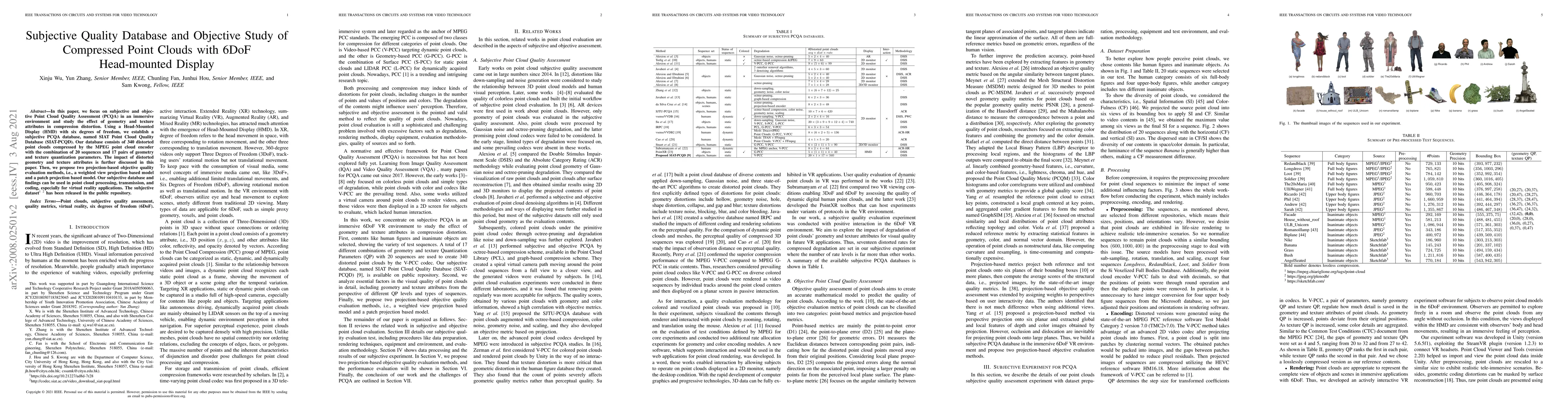 This paper establishes a subjective Point Cloud Quality Assessment (PCQA) database using a 6DoF HMD, analyzing the effects of geometry and texture compression distortion. It also proposes two objective quality evaluation methods and releases the dataset for VR applications.