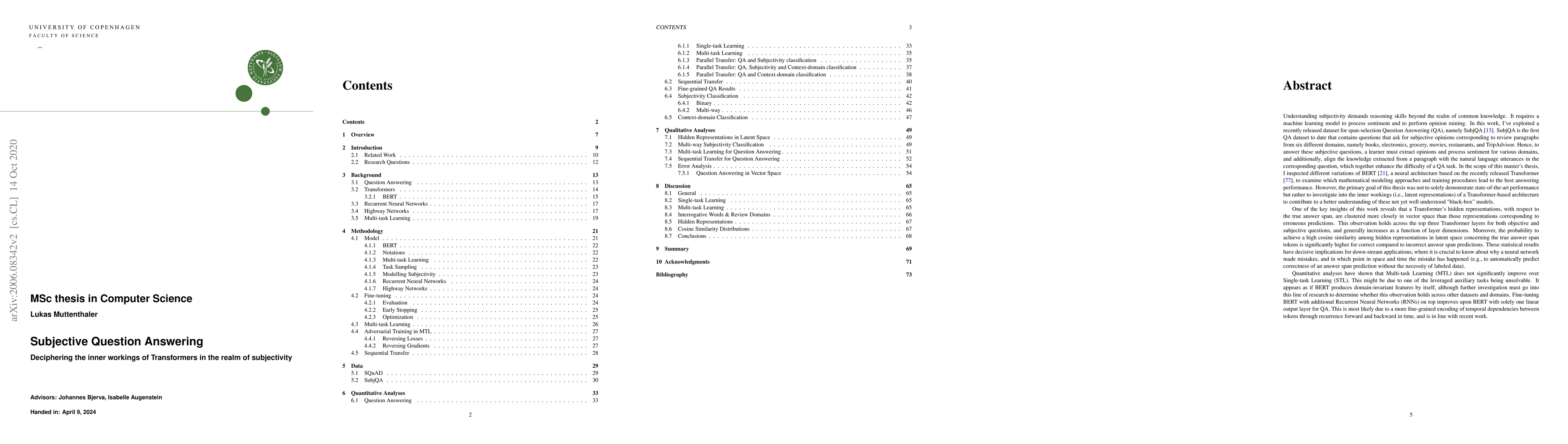 Understanding subjectivity demands reasoning skills beyond the realm of common knowledge. It requires a machine learning model to process sentiment and to perform opinion mining. In this work, I've exploited a recently released dataset for span-selection Question Answering, namely SubjQA. SubjQA is the first QA dataset that contains questions that ask for subjective opinions corresponding to review paragraphs from six different domains. Hence, to answer these subjective questions, a learner must extract opinions and process sentiment for various domains, and additionally, align the knowledge extracted from a paragraph with the natural language utterances in the corresponding question, which together enhance the difficulty of a QA task. The primary goal of this thesis was to investigate the inner workings (i.e., latent representations) of a Transformer-based architecture to contribute to a better understanding of these not yet well understood "black-box" models. Transformer's hidden representations, concerning the true answer span, are clustered more closely in vector space than those representations corresponding to erroneous predictions. This observation holds across the top three Transformer layers for both objective and subjective questions and generally increases as a function of layer dimensions. Moreover, the probability to achieve a high cosine similarity among hidden representations in latent space concerning the true answer span tokens is significantly higher for correct compared to incorrect answer span predictions. These results have decisive implications for down-stream applications, where it is crucial to know about why a neural network made mistakes, and in which point, in space and time the mistake has happened (e.g., to automatically predict correctness of an answer span prediction without the necessity of labeled data).