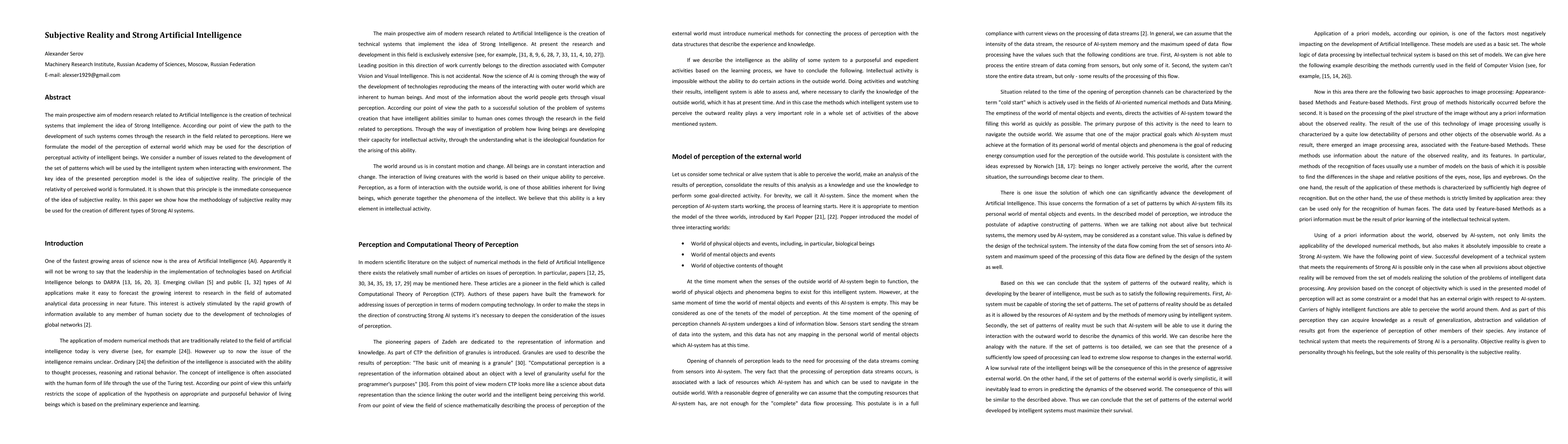 This paper proposes a perception model for Strong Artificial Intelligence based on the concept of subjective reality, emphasizing the relativity of perceived world. It outlines how this methodology can be applied to develop advanced AI systems that interact with their environment through subjective interpretations.