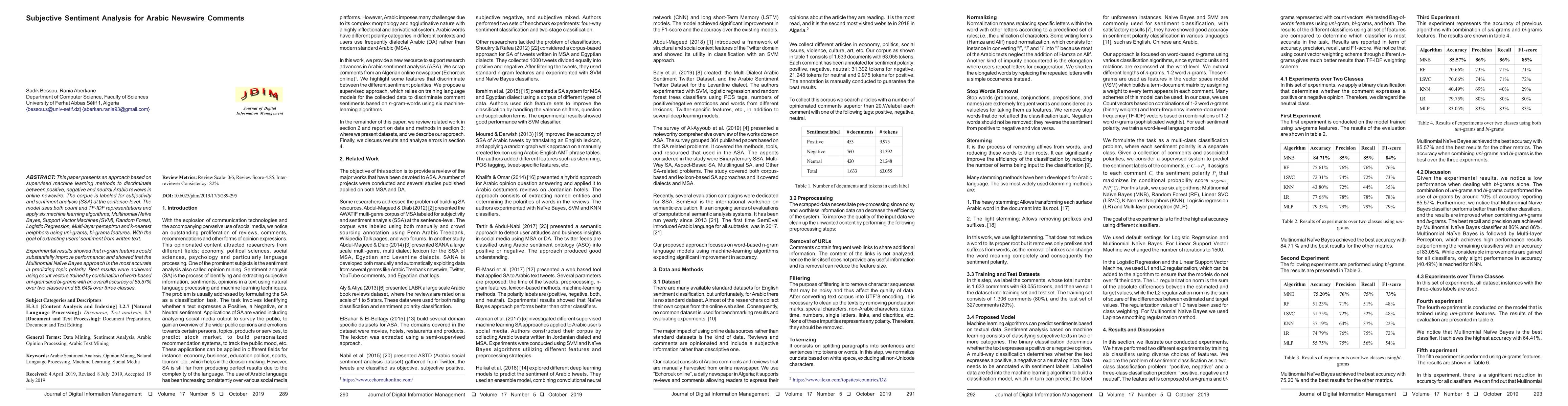 This paper develops a supervised machine learning model to classify Arabic newswire comments into positive, negative, and neutral sentiments, achieving an accuracy of 85.57% for two-class and 65.64% for three-class predictions, with the Multinomial Naive Bayes method proving most effective.