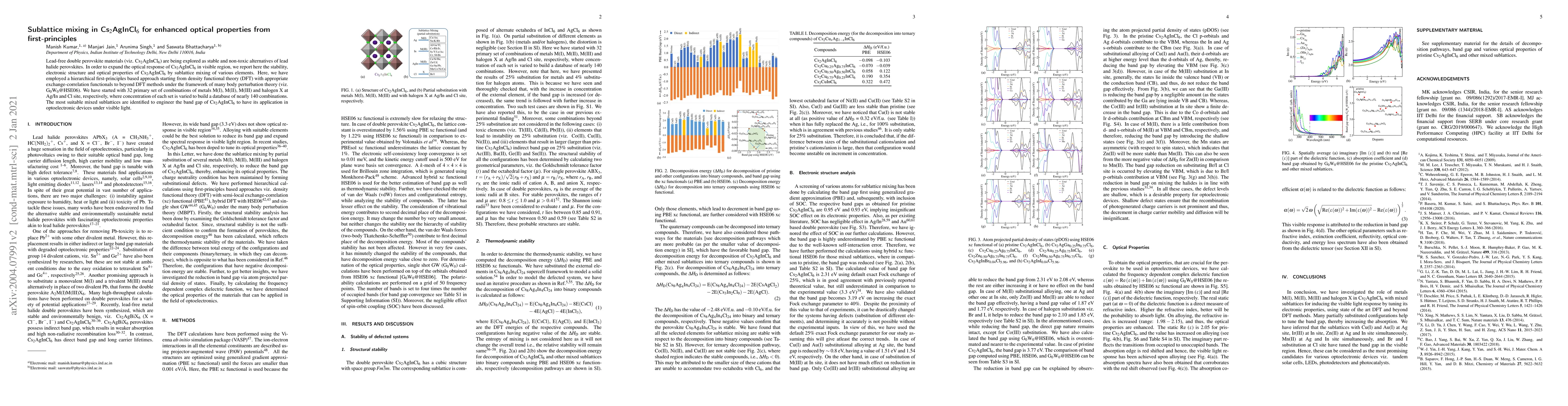 Lead-free double perovskite materials (viz. Cs$_2$AgInCl$_6$) are being explored as stable and non-toxic alternatives of lead halide perovskites. In order to expand the optical response of Cs$_2$AgInCl$_6$ in visible region, we report here the stability, electronic structure and optical properties of Cs$_2$AgInCl$_6$ by sublattice mixing of various elements. Here, we have employed %high-throughput screening using a hierarchical first-principles based approach starting from density functional theory (DFT) with appropriate exchange-correlation functionals to beyond DFT methods under the framework of many body perturbation theory (viz. G$_0$W$_0$@HSE06). We have started with 32 primary set of combinations of metals M(I), M(II), M(III) and halogen X at Ag/In and Cl site, respectively, where concentration of each set is varied to build a database of nearly 140 combinations. The most suitable mixed sublattices are identified to engineer the band gap of Cs$_2$AgInCl$_6$ to have its application in optoelectronic devices under visible light.