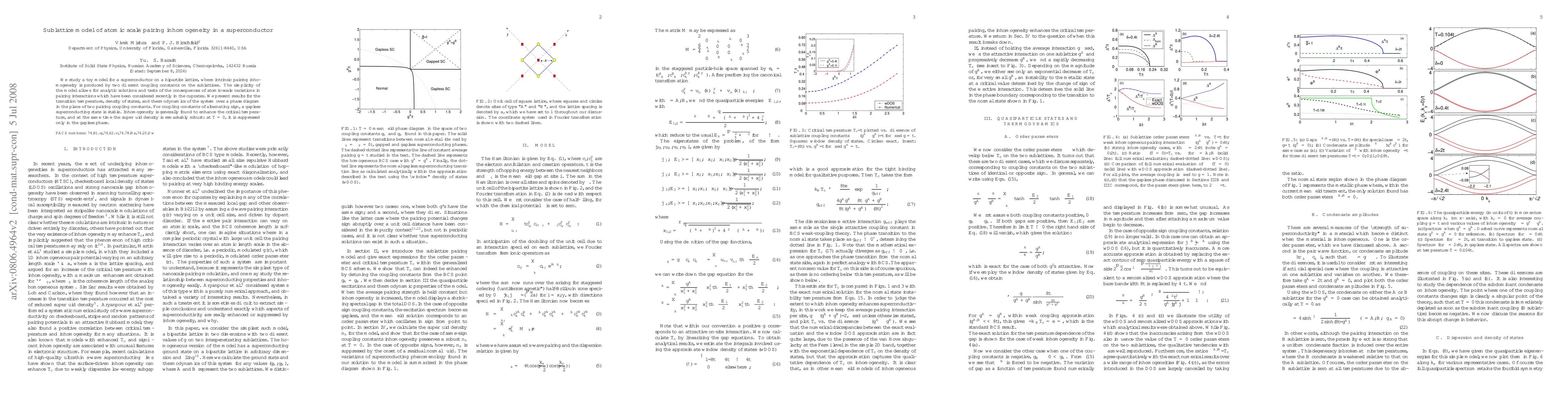 This research introduces a simplified model to study atomic-scale pairing inhomogeneity in superconductors, using a bipartite lattice with distinct coupling constants. The model offers analytic solutions, revealing that inhomogeneity raises the critical temperature and maintains a robust superfluid density, even enabling a gapless superconducting state with alternating sign couplings.