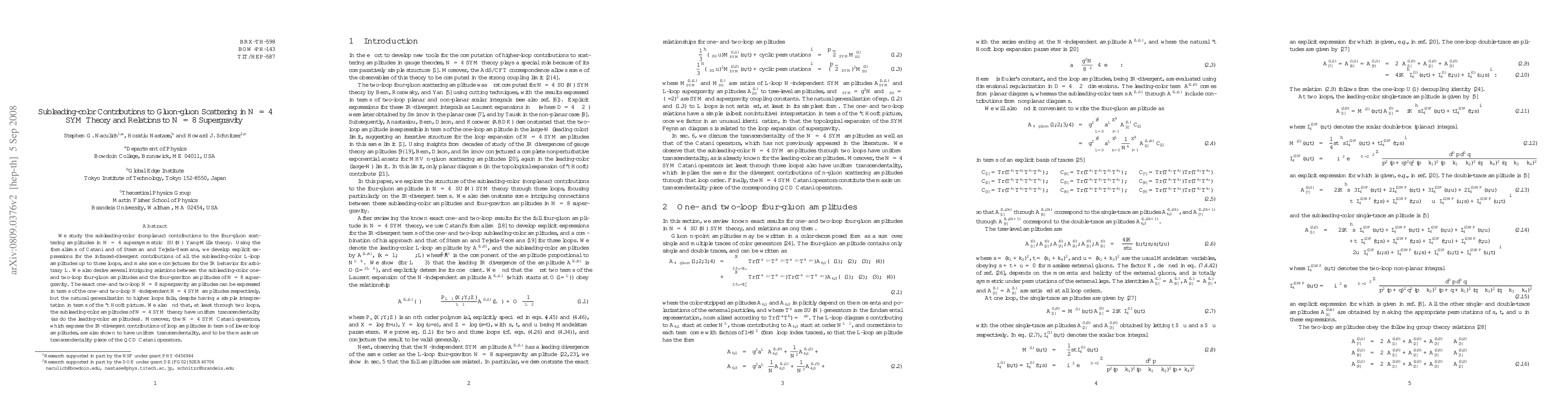 We study the subleading-color (nonplanar) contributions to the four-gluon scattering amplitudes in N=4 supersymmetric SU(N) Yang-Mills theory. Using the formalisms of Catani and of Sterman and Tejeda-Yeomans, we develop explicit expressions for the infrared-divergent contributions of all the subleading-color L-loop amplitudes up to three loops, and make some conjectures for the IR behavior for arbitrary L. We also derive several intriguing relations between the subleading-color one- and two-loop four-gluon amplitudes and the four-graviton amplitudes of N=8 supergravity. The exact one- and two-loop N=8 supergravity amplitudes can be expressed in terms of the one- and two-loop N-independent N=4 SYM amplitudes respectively, but the natural generalization to higher loops fails, despite having a simple interpretation in terms of the 't Hooft picture. We also find that, at least through two loops, the subleading-color amplitudes of N=4 SYM theory have uniform transcendentality (as do the leading-color amplitudes). Moreover, the N=4 SYM Catani operators, which express the IR-divergent contributions of loop amplitudes in terms of lower-loop amplitudes, are also shown to have uniform transcendentality, and to be the maximum transcendentality piece of the QCD Catani operators.