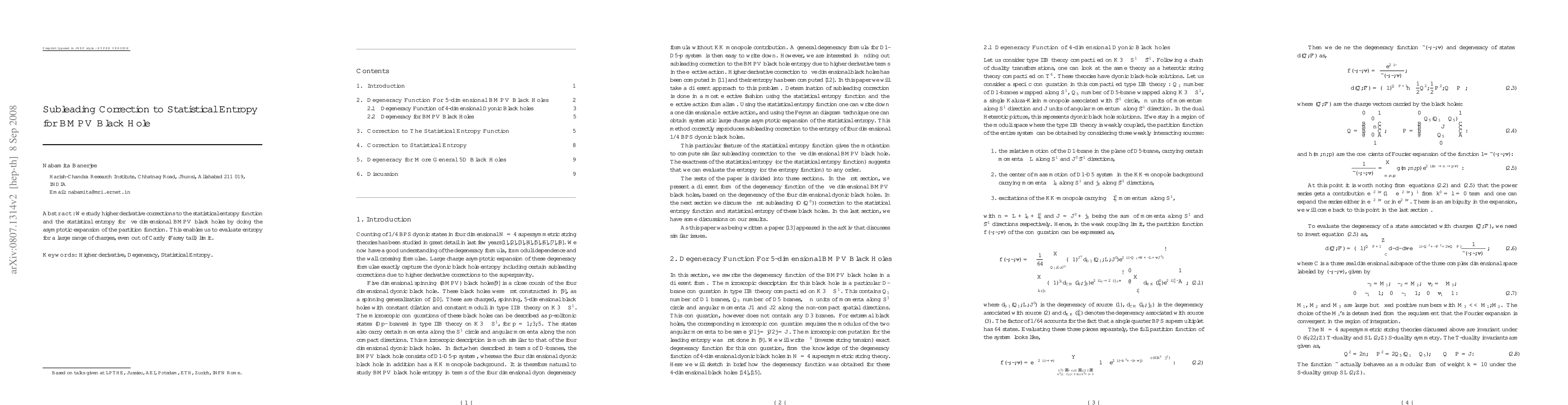 The paper presents a detailed computation of the statistical entropy function for five-dimensional BMPV black holes up to the first sub-leading correction, using asymptotic expansion of the partition function.