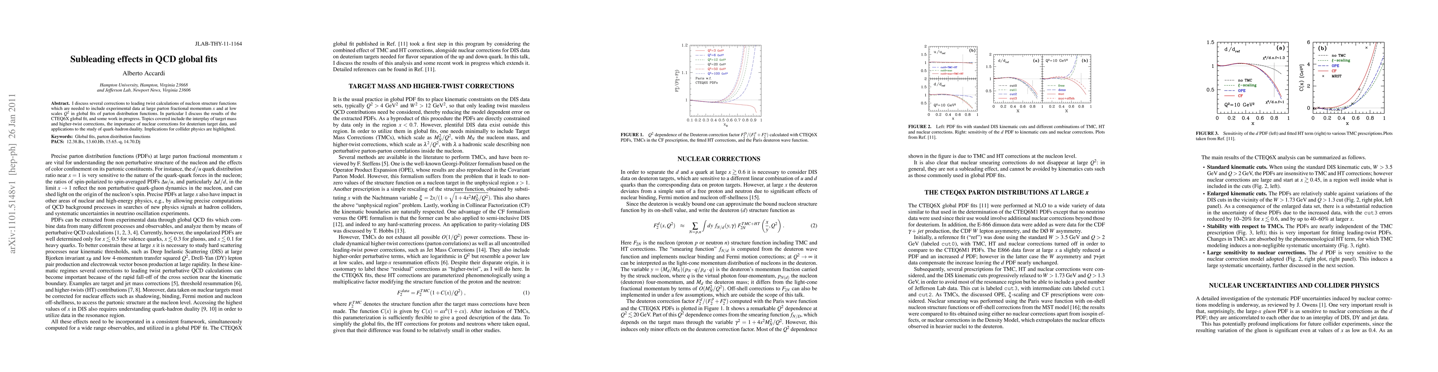 I discuss several corrections to leading twist calculations of nucleon structure functions which are needed to include experimental data at large parton fractional momentum x and at low scales Q^2 in global fits of parton distribution functions. In particular I discuss the results of the CTEQ6X global fit, and some work in progress. Topics covered include the interplay of target mass and higher-twist corrections, the importance of nuclear corrections for deuterium target data, and applications to the study of quark-hadron duality. Implications for collider physics are highlighted.