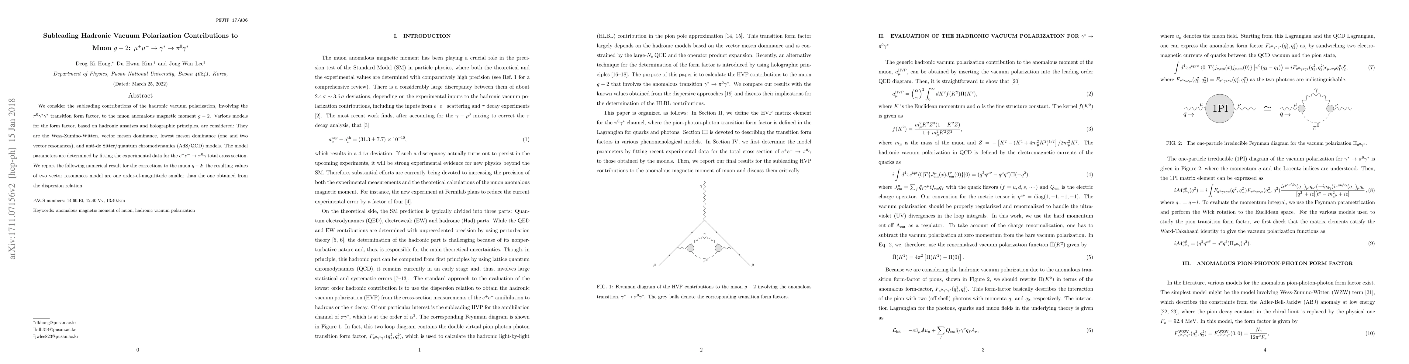 We consider the subleading contributions of the hadronic vacuum polarization, involving the $\pi^0\gamma^*\gamma^*$ transition form factor, to the muon anomalous magnetic moment $g-2$. Various models for the form factor, based on hadronic ansatzes and holographic principles, are considered: They are the Wess-Zumino-Witten, vector meson dominance, lowest meson dominance (one and two vector resonances) models, and AdS/QCD. The model parameters are determined by fitting the experimental data for the $e^+ e^- \rightarrow \pi^0 \gamma$ total cross section. We report numerical results of the corrections to the muon $g-2$ that the resulting values of two vector resonances model are of order-of-magntitude smaller than the one obtained from the dispersion relation.