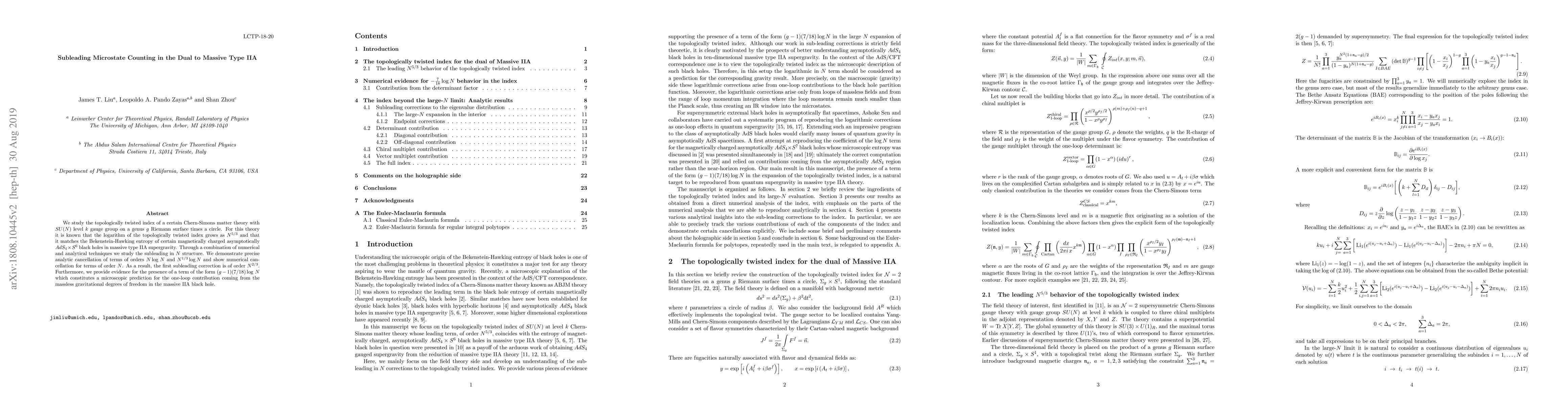 This paper investigates the subleading corrections in the topologically twisted index of a Chern-Simons matter theory, revealing precise cancellations in terms of $N\log\,N$ and $N^{1/3}\log N$, and identifies the first subleading correction as $N^{2/3}$. It also predicts a one-loop contribution term of $(g-1)(7/18) \log \,N$ from massless gravitational degrees of freedom in massive type IIA black holes.