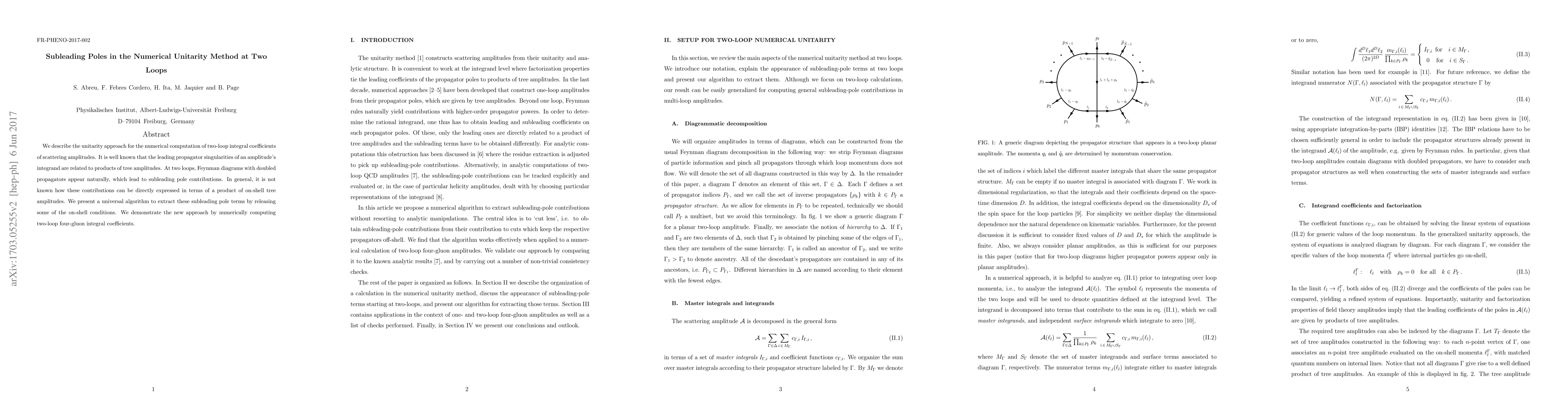 This paper introduces a novel algorithm for extracting subleading pole contributions in two-loop scattering amplitudes using the unitarity method, addressing the challenge of expressing these contributions in terms of tree-level amplitudes. The method is demonstrated through the numerical computation of two-loop four-gluon integral coefficients.