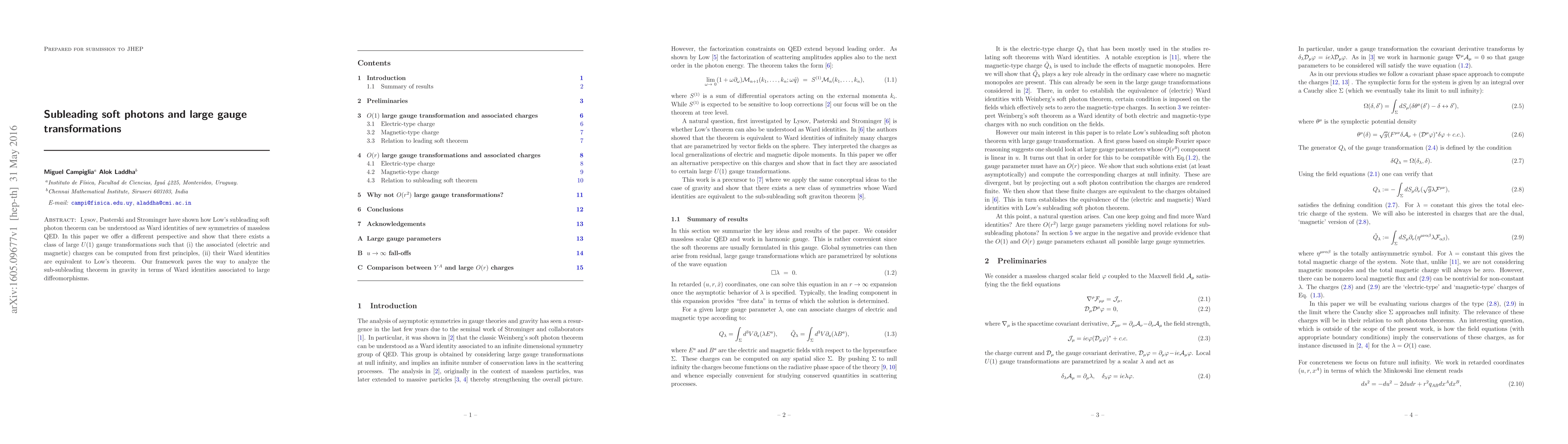 This paper presents an alternative view on Low's subleading soft photon theorem, demonstrating that it arises from the Ward identities of large $U(1)$ gauge transformations, providing a new framework for analyzing sub-subleading theorems in gravity via large diffeomorphisms.
