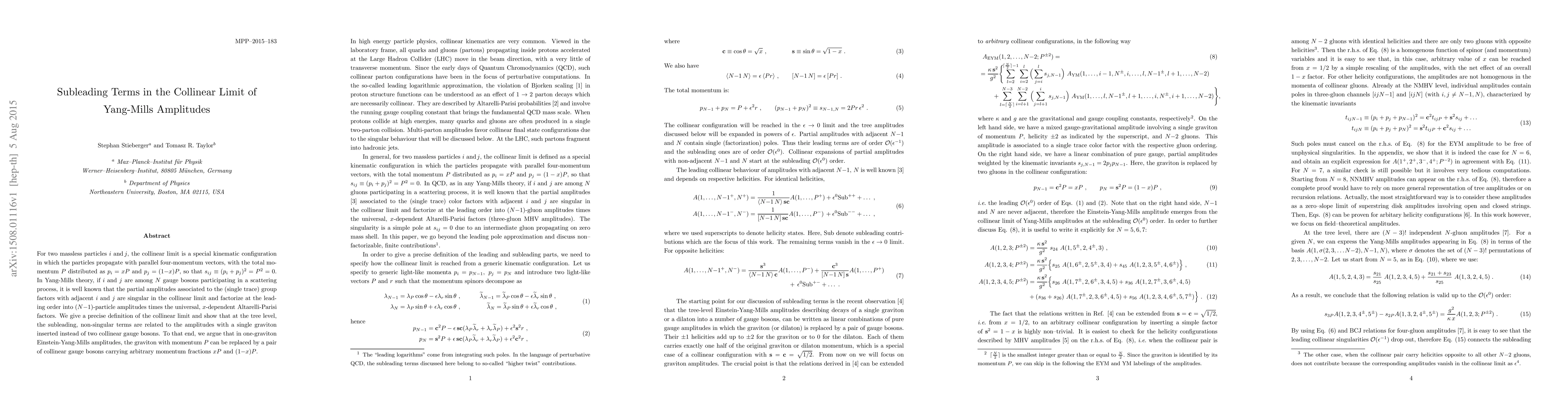For two massless particles i and j, the collinear limit is a special kinematic configuration in which the particles propagate with parallel four-momentum vectors, with the total momentum P distributed as p_i=xP and p_j=(1-x)P, so that s_{ij}=(p_i+p_j)^2=P^2=0. In Yang-Mills theory, if i and j are among N gauge bosons participating in a scattering process, it is well known that the partial amplitudes associated to the (single trace) group factors with adjacent i and j are singular in the collinear limit and factorize at the leading order into N-1-particle amplitudes times the universal, x-dependent Altarelli-Parisi factors. We give a precise definition of the collinear limit and show that at the tree level, the subleading, non-singular terms are related to the amplitudes with a single graviton inserted instead of two collinear gauge bosons. To that end, we argue that in one-graviton Einstein-Yang-Mills amplitudes, the graviton with momentum P can be replaced by a pair of collinear gauge bosons carrying arbitrary momentum fractions xP and (1-x)P.