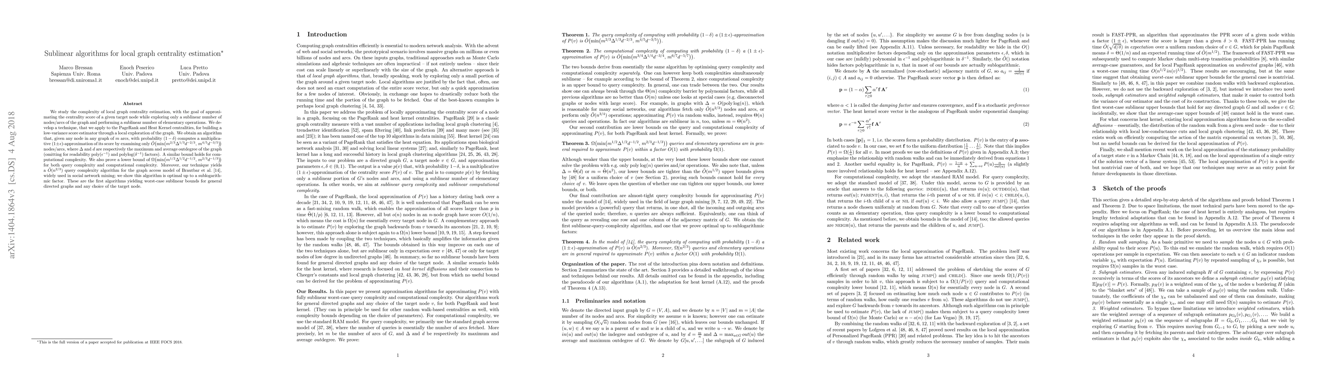 We study the complexity of local graph centrality estimation, with the goal of approximating the centrality score of a given target node while exploring only a sublinear number of nodes/arcs of the graph and performing a sublinear number of elementary operations. We develop a technique, that we apply to the PageRank and Heat Kernel centralities, for building a low-variance score estimator through a local exploration of the graph. We obtain an algorithm that, given any node in any graph of $m$ arcs, with probability $(1-\delta)$ computes a multiplicative $(1\pm\epsilon)$-approximation of its score by examining only $\tilde{O}(\min(m^{2/3} \Delta^{1/3} d^{-2/3},\, m^{4/5} d^{-3/5}))$ nodes/arcs, where $\Delta$ and $d$ are respectively the maximum and average outdegree of the graph (omitting for readability $\operatorname{poly}(\epsilon^{-1})$ and $\operatorname{polylog}(\delta^{-1})$ factors). A similar bound holds for computational complexity. We also prove a lower bound of $\Omega(\min(m^{1/2} \Delta^{1/2} d^{-1/2}, \, m^{2/3} d^{-1/3}))$ for both query complexity and computational complexity. Moreover, our technique yields a $\tilde{O}(n^{2/3})$ query complexity algorithm for the graph access model of [Brautbar et al., 2010], widely used in social network mining; we show this algorithm is optimal up to a sublogarithmic factor. These are the first algorithms yielding worst-case sublinear bounds for general directed graphs and any choice of the target node.