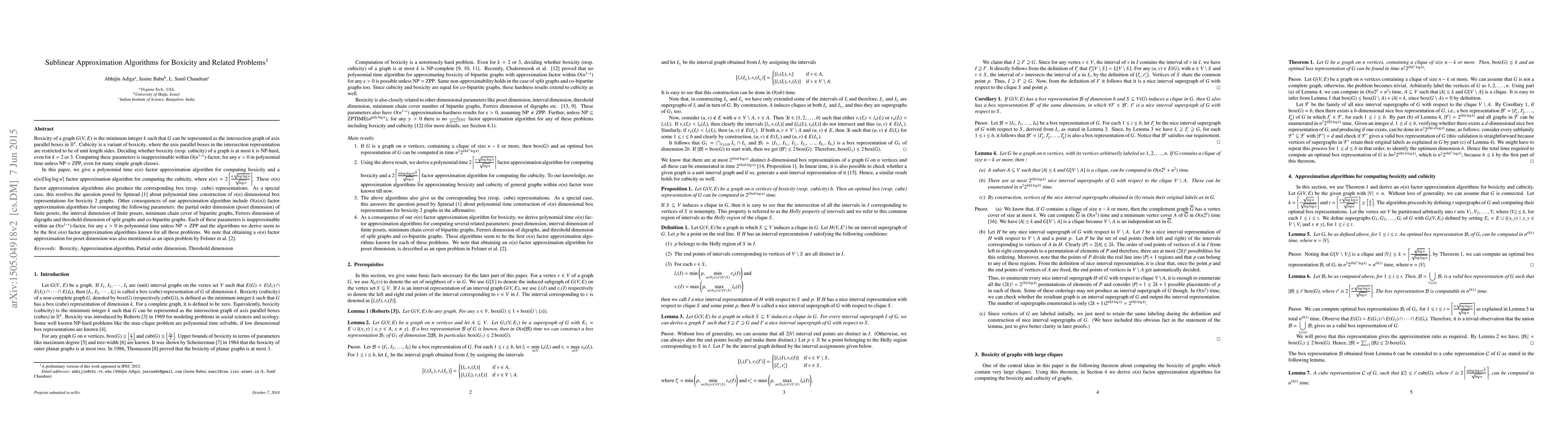 Boxicity of a graph G(V, E) is the minimum integer k such that G can be represented as the intersection graph of axis parallel boxes in $\mathbb{R}^k$. Cubicity is a variant of boxicity, where the axis parallel boxes in the intersection representation are restricted to be of unit length sides. Deciding whether boxicity (resp. cubicity) of a graph is at most k is NP-hard, even for k=2 or 3. Computing these parameters is inapproximable within $O(n^{1 - \epsilon})$-factor, for any $\epsilon >0$ in polynomial time unless NP=ZPP, even for many simple graph classes. In this paper, we give a polynomial time $\kappa(n)$ factor approximation algorithm for computing boxicity and a $\kappa(n)\lceil \log \log n\rceil$ factor approximation algorithm for computing the cubicity, where $\kappa(n) =2\left\lceil\frac{n\sqrt{\log \log n}}{\sqrt{\log n}}\right\rceil$. These o(n) factor approximation algorithms also produce the corresponding box (resp. cube) representations. As a special case, this resolves the question paused by Spinrad about polynomial time construction of o(n) dimensional box representations for boxicity 2 graphs. Other consequences of our approximation algorithm include $O(\kappa(n))$ factor approximation algorithms for computing the following parameters: the partial order dimension of finite posets, the interval dimension of finite posets, minimum chain cover of bipartite graphs, threshold dimension of split graphs and Ferrer's dimension of digraphs. Each of these parameters is inapproximable within an $O(n^{1 - \epsilon})$-factor, for any $\epsilon >0$ in polynomial time unless NP=ZPP and the algorithms we derive seem to be the first o(n) factor approximation algorithms known for all these problems.