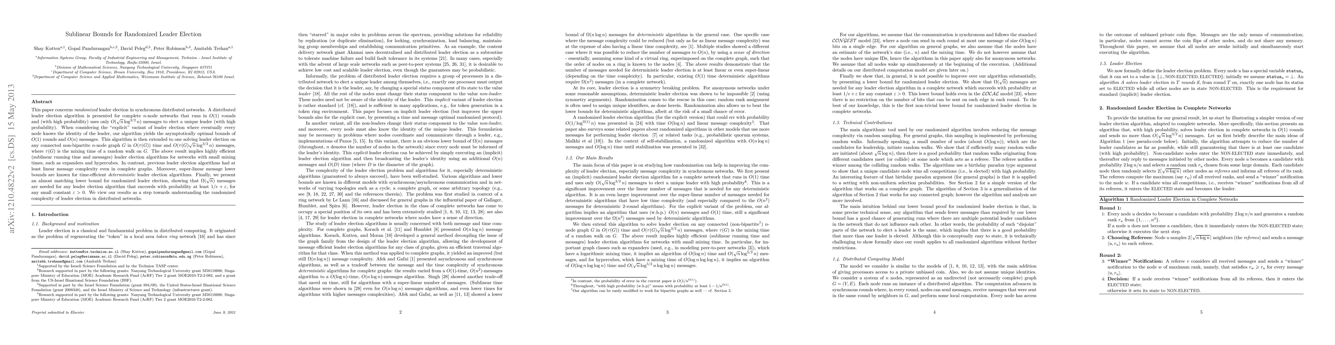 This paper presents a randomized leader election algorithm for complete networks that runs in O(1) rounds and uses O(√n log^(3/2) n) messages, achieving sublinear bounds. The algorithm extends to connected non-bipartite graphs, achieving efficiency based on the graph's mixing time, and provides an almost matching lower bound for randomized leader election.