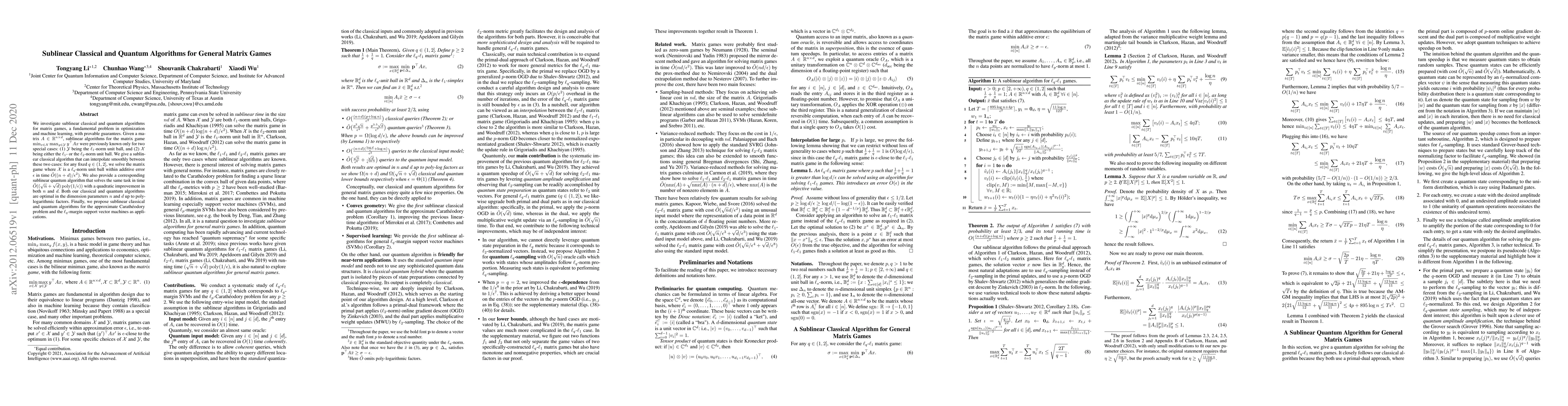 We investigate sublinear classical and quantum algorithms for matrix games, a fundamental problem in optimization and machine learning, with provable guarantees. Given a matrix $A\in\mathbb{R}^{n\times d}$, sublinear algorithms for the matrix game $\min_{x\in\mathcal{X}}\max_{y\in\mathcal{Y}} y^{\top} Ax$ were previously known only for two special cases: (1) $\mathcal{Y}$ being the $\ell_{1}$-norm unit ball, and (2) $\mathcal{X}$ being either the $\ell_{1}$- or the $\ell_{2}$-norm unit ball. We give a sublinear classical algorithm that can interpolate smoothly between these two cases: for any fixed $q\in (1,2]$, we solve the matrix game where $\mathcal{X}$ is a $\ell_{q}$-norm unit ball within additive error $\epsilon$ in time $\tilde{O}((n+d)/{\epsilon^{2}})$. We also provide a corresponding sublinear quantum algorithm that solves the same task in time $\tilde{O}((\sqrt{n}+\sqrt{d})\textrm{poly}(1/\epsilon))$ with a quadratic improvement in both $n$ and $d$. Both our classical and quantum algorithms are optimal in the dimension parameters $n$ and $d$ up to poly-logarithmic factors. Finally, we propose sublinear classical and quantum algorithms for the approximate Carath\'eodory problem and the $\ell_{q}$-margin support vector machines as applications.