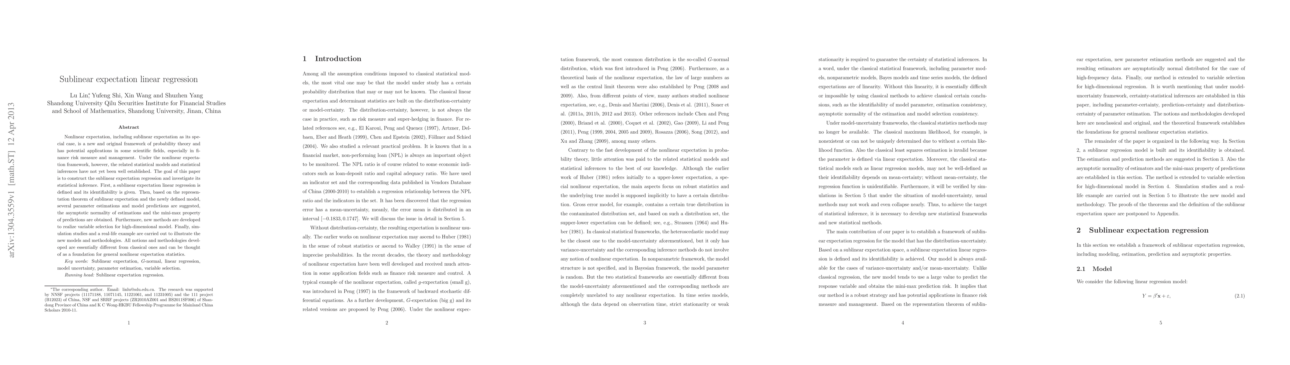 This paper introduces sublinear expectation linear regression, establishing its identifiability and proposing parameter estimations and prediction methods under the nonlinear expectation framework. It also develops variable selection techniques for high-dimensional models and demonstrates the effectiveness through simulations and a real-life example.