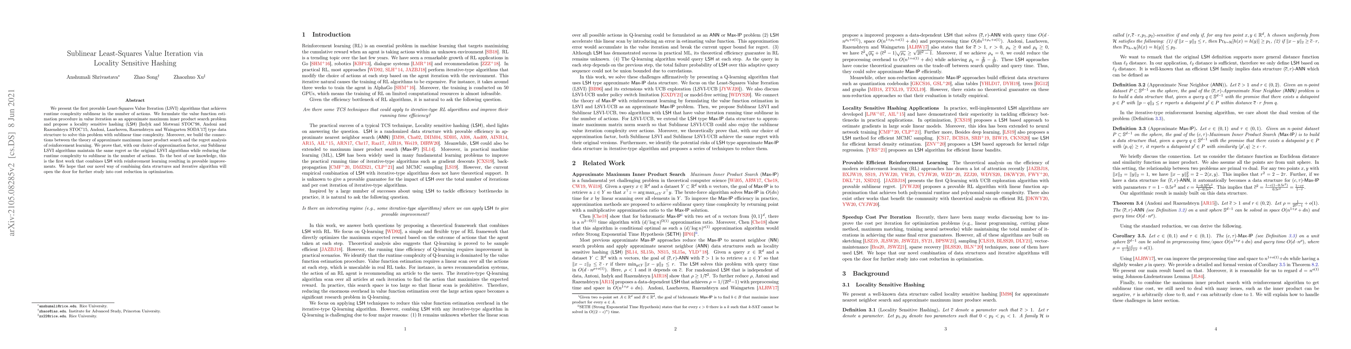 This paper introduces the first sublinear time complexity Least-Squares Value Iteration (LSVI) algorithms using locality sensitive hashing (LSH) to address the maximum inner product search problem. It demonstrates that these algorithms maintain the same regret as traditional LSVI while significantly reducing runtime complexity.