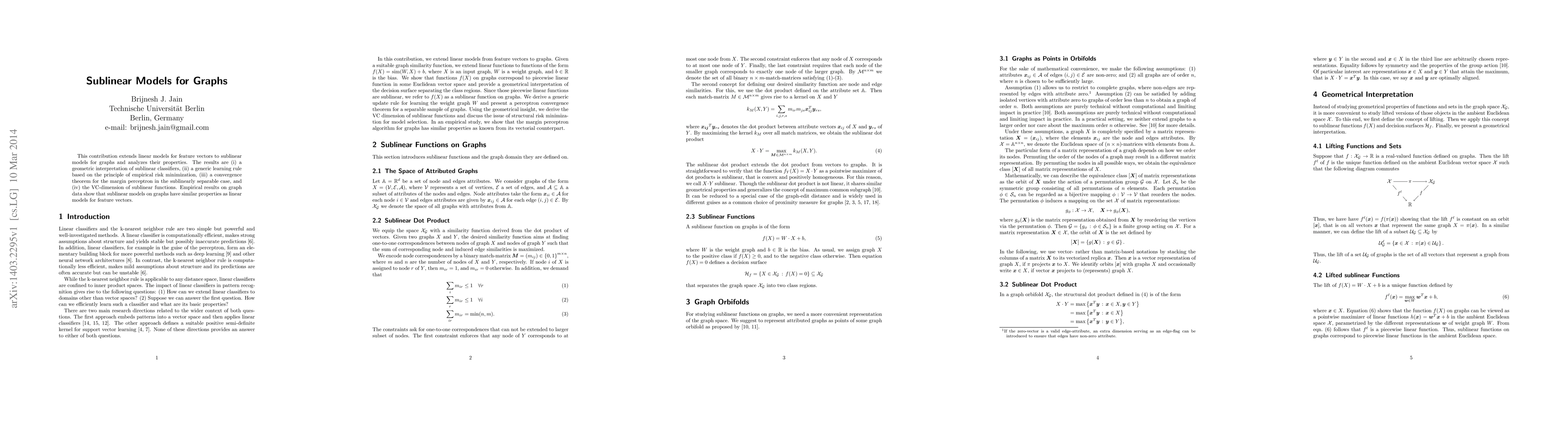 This contribution extends linear models for feature vectors to sublinear models for graphs and analyzes their properties. The results are (i) a geometric interpretation of sublinear classifiers, (ii) a generic learning rule based on the principle of empirical risk minimization, (iii) a convergence theorem for the margin perceptron in the sublinearly separable case, and (iv) the VC-dimension of sublinear functions. Empirical results on graph data show that sublinear models on graphs have similar properties as linear models for feature vectors.