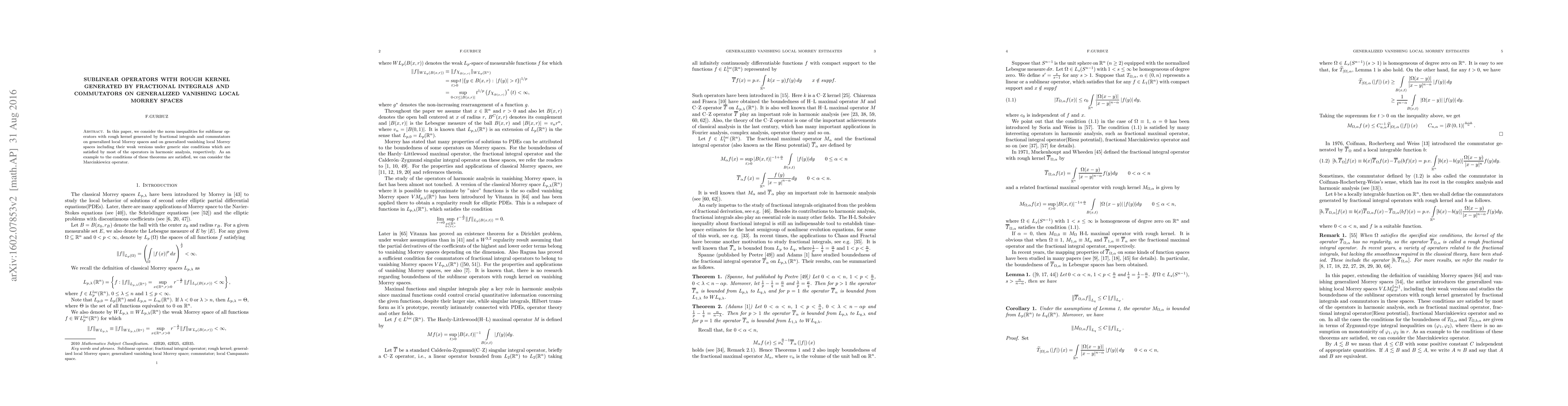 This paper investigates norm inequalities for sublinear operators with rough kernels, generated by fractional integrals and commutators, on generalized vanishing local Morrey spaces, including weak versions under size conditions typical in harmonic analysis, exemplified by the Marcinkiewicz operator.