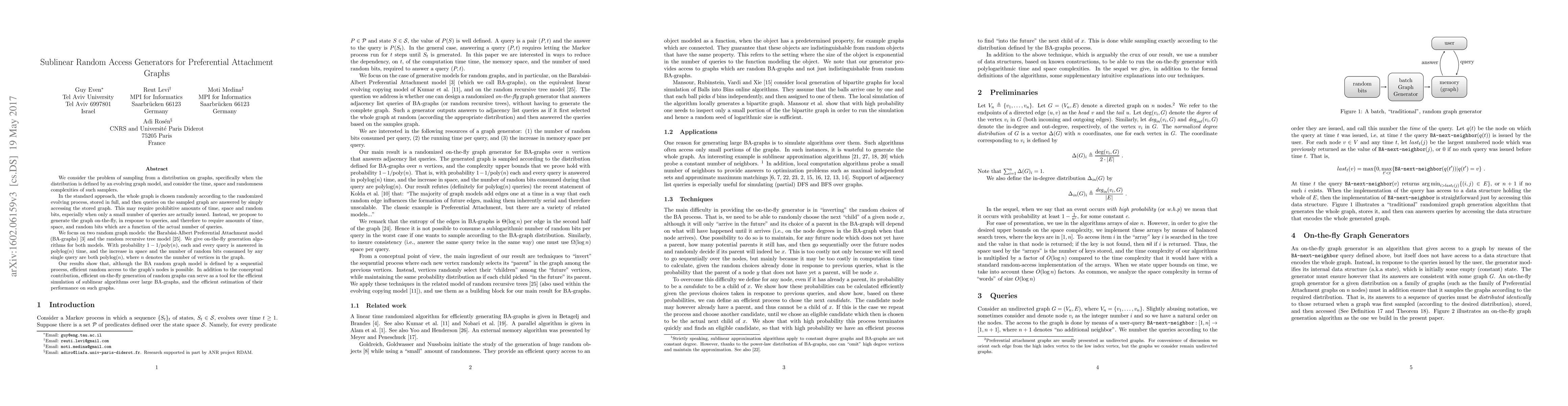 We consider the problem of sampling from a distribution on graphs, specifically when the distribution is defined by an evolving graph model, and consider the time, space and randomness complexities of such samplers. In the standard approach, the whole graph is chosen randomly according to the randomized evolving process, stored in full, and then queries on the sampled graph are answered by simply accessing the stored graph. This may require prohibitive amounts of time, space and random bits, especially when only a small number of queries are actually issued. Instead, we propose to generate the graph on-the-fly, in response to queries, and therefore to require amounts of time, space, and random bits which are a function of the actual number of queries. We focus on two random graph models: the Barab{\'{a}}si-Albert Preferential Attachment model (BA-graphs) and the random recursive tree model. We give on-the-fly generation algorithms for both models. With probability $1-1/\mbox{poly}(n)$, each and every query is answered in $\mbox{polylog}(n)$ time, and the increase in space and the number of random bits consumed by any single query are both $\mbox{polylog}(n)$, where $n$ denotes the number of vertices in the graph. Our results show that, although the BA random graph model is defined by a sequential process, efficient random access to the graph's nodes is possible. In addition to the conceptual contribution, efficient on-the-fly generation of random graphs can serve as a tool for the efficient simulation of sublinear algorithms over large BA-graphs, and the efficient estimation of their performance on such graphs.