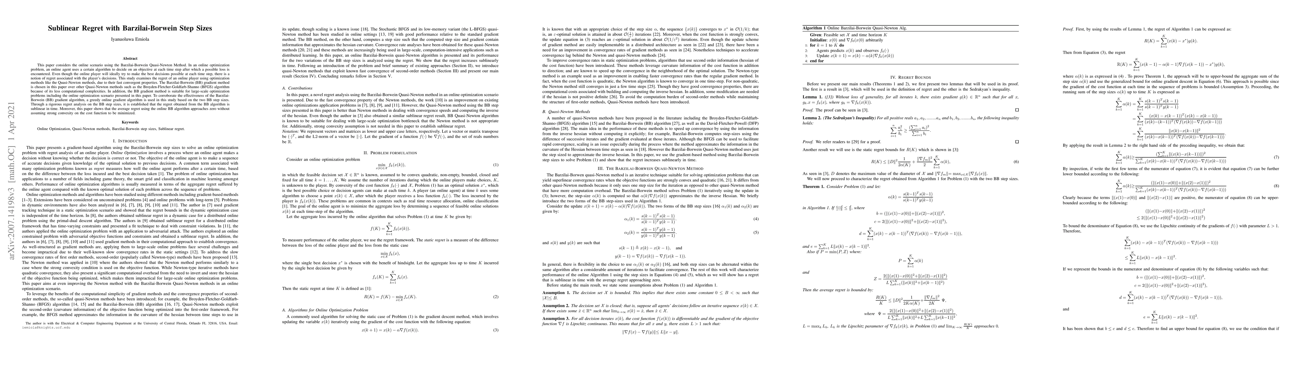This paper considers the online scenario using the Barzilai-Borwein Quasi-Newton Method. In an online optimization problem, an online agent uses a certain algorithm to decide on an objective at each time step after which a possible loss is encountered. Even though the online player will ideally try to make the best decisions possible at each time step, there is a notion of regret associated with the player's decisions. This study examines the regret of an online player using optimization methods like the Quasi-Newton methods, due to their fast convergent properties. The Barzilai-Borwein (BB) gradient method is chosen in this paper over other Quasi-Newton methods such as the Broyden-Fletcher-Goldfarb-Shanno (BFGS) algorithm because of its less computational complexities. In addition, the BB gradient method is suitable for large-scale optimization problems including the online optimization scenario presented in this paper. To corroborate the effectiveness of the Barzilai-Borwein (BB) gradient algorithm, a greedy online gradient algorithm is used in this study based on the two BB step sizes. Through a rigorous regret analysis on the BB step sizes, it is established that the regret obtained from the BB algorithm is sublinear in time. Moreover, this paper shows that the average regret using the online BB algorithm approaches zero without assuming strong convexity on the cost function to be minimized.