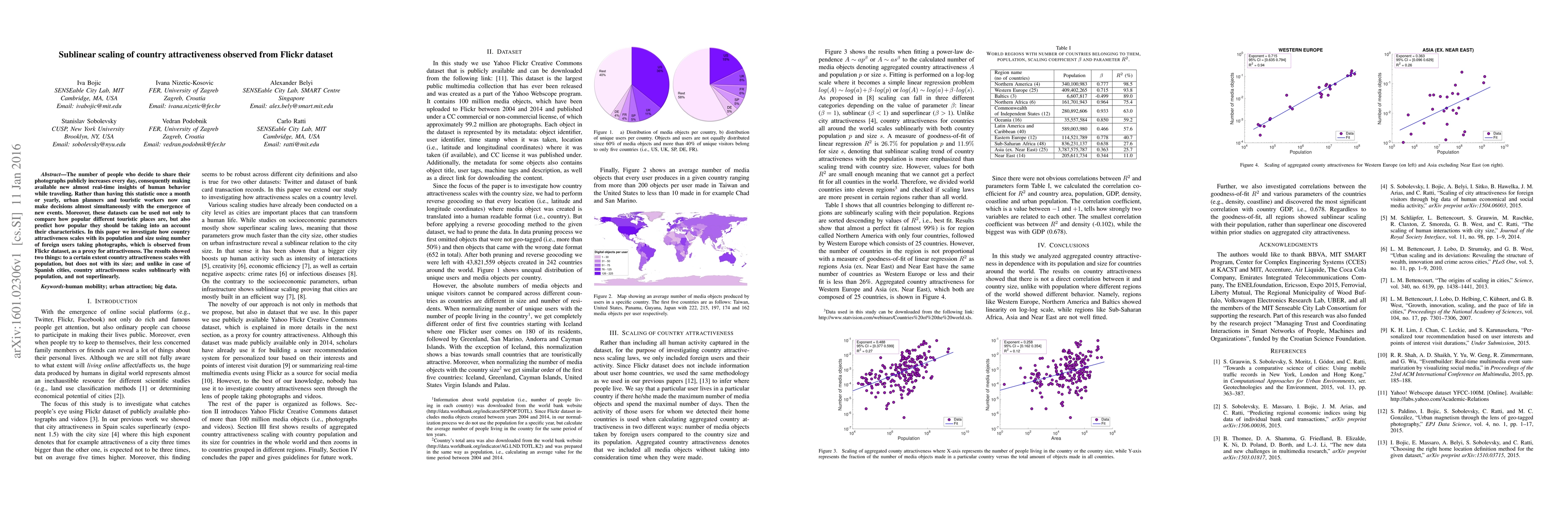 This paper uses Flickr data to analyze how country attractiveness correlates with population and size, finding that attractiveness scales sublinearly with population but not with size. The study provides real-time insights for urban planners and tourism workers, highlighting the potential for predictive modeling based on photo-sharing data.