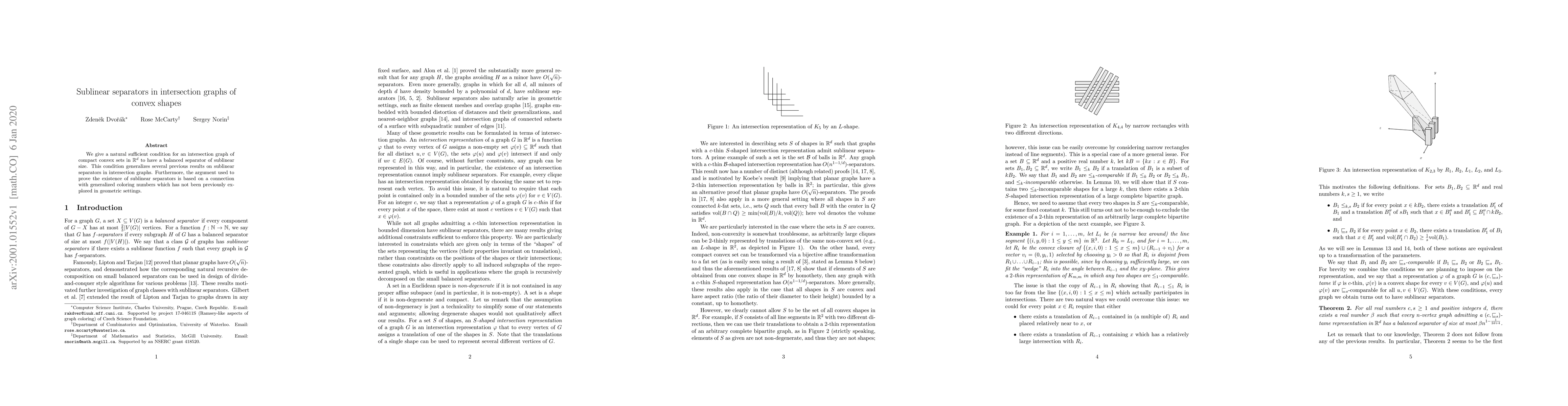 This paper presents a sufficient condition for intersection graphs of convex shapes in R^d to have balanced separators of sublinear size, generalizing prior results. The proof leverages a novel connection between these separators and generalized coloring numbers in geometric settings.