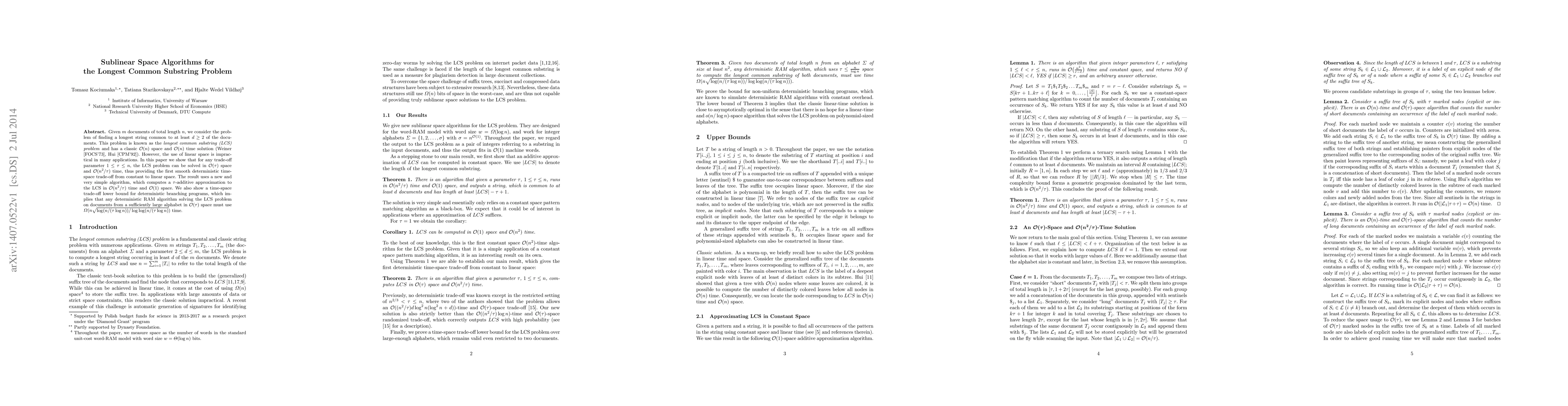 The paper presents a new algorithm for the Longest Common Substring (LCS) problem that operates in O(n^2/τ) time using O(1) space, providing a smooth deterministic time-space trade-off from constant to linear space. It uses a simple algorithm to compute a τ-additive approximation to the LCS.