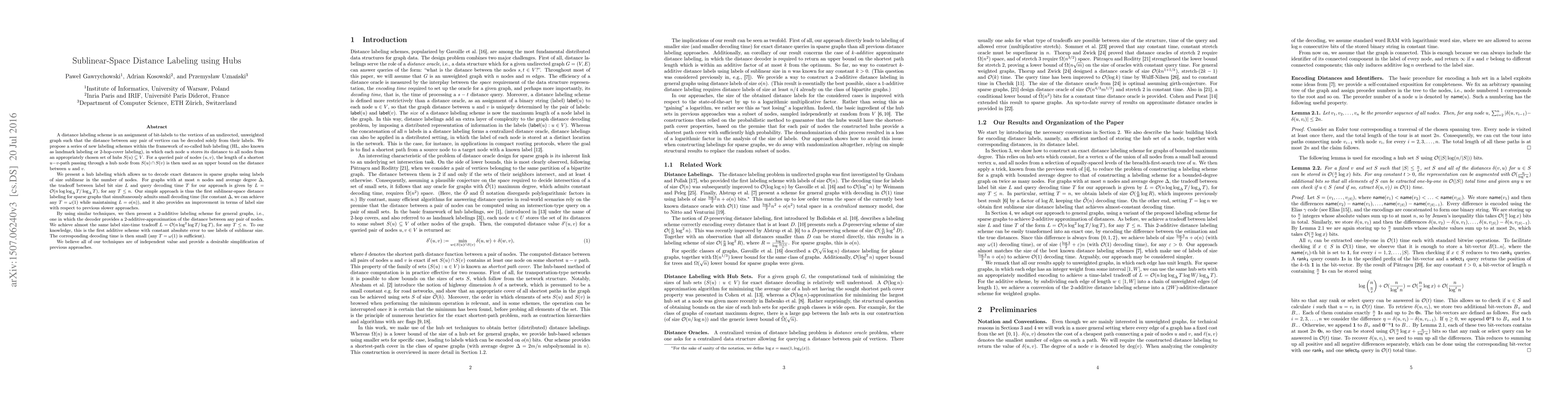 This paper proposes new distance labeling schemes using hub labeling for undirected, unweighted graphs. It achieves sublinear label size for sparse graphs with small query decoding time, and presents a 2-additive labeling scheme for general graphs with sublinear label size and constant error.