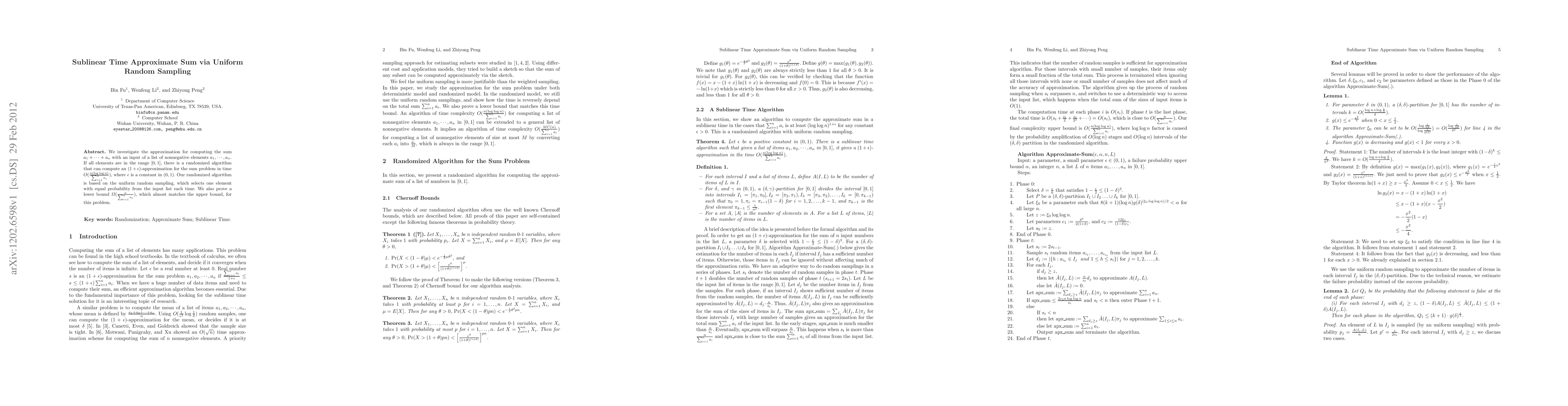 We investigate the approximation for computing the sum $a_1+...+a_n$ with an input of a list of nonnegative elements $a_1,..., a_n$. If all elements are in the range $[0,1]$, there is a randomized algorithm that can compute an $(1+\epsilon)$-approximation for the sum problem in time ${O({n(\log\log n)\over\sum_{i=1}^n a_i})}$, where $\epsilon$ is a constant in $(0,1)$. Our randomized algorithm is based on the uniform random sampling, which selects one element with equal probability from the input list each time. We also prove a lower bound $\Omega({n\over \sum_{i=1}^n a_i})$, which almost matches the upper bound, for this problem.