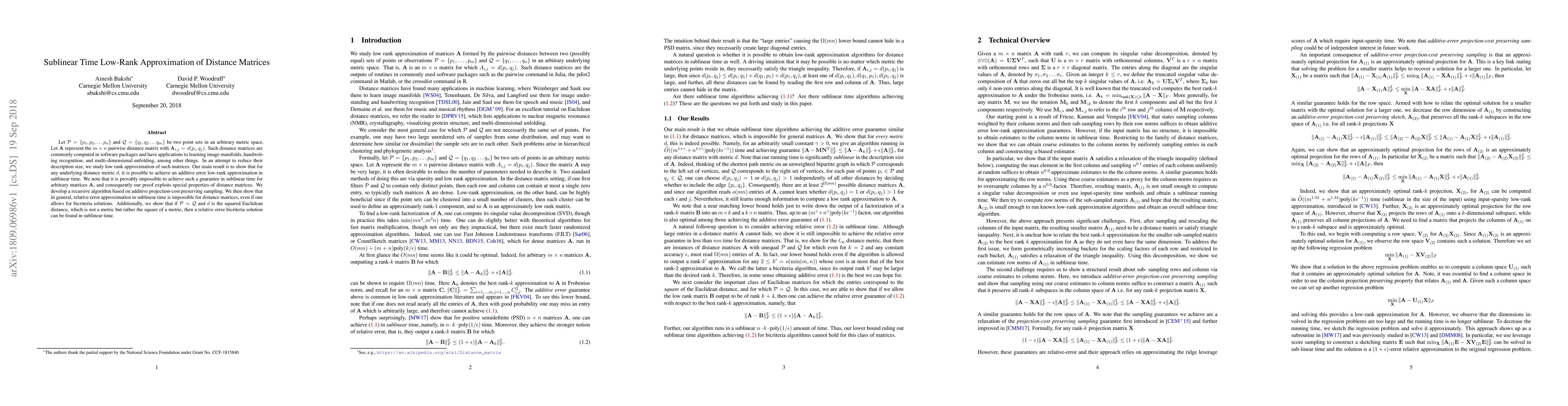 This paper presents a sublinear time algorithm for low-rank approximation of distance matrices, exploiting the special properties of such matrices to achieve additive error guarantees. It also proves that relative error approximation in sublinear time is generally impossible, except for the case where points are identical and the distance is squared Euclidean.
