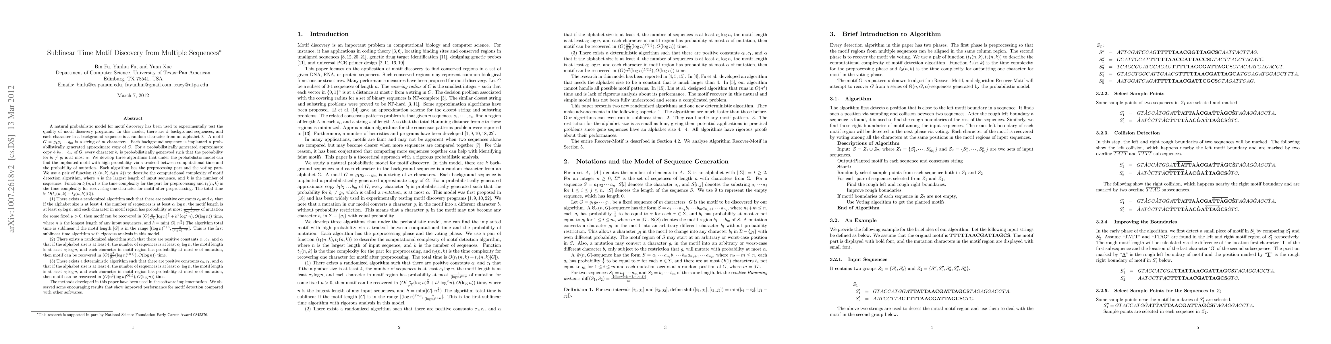 This paper presents three algorithms for sublinear time motif discovery from multiple sequences under a probabilistic model, achieving high accuracy with a balance between computational efficiency and mutation probability. The developed methods show improved motif detection performance compared to existing software.