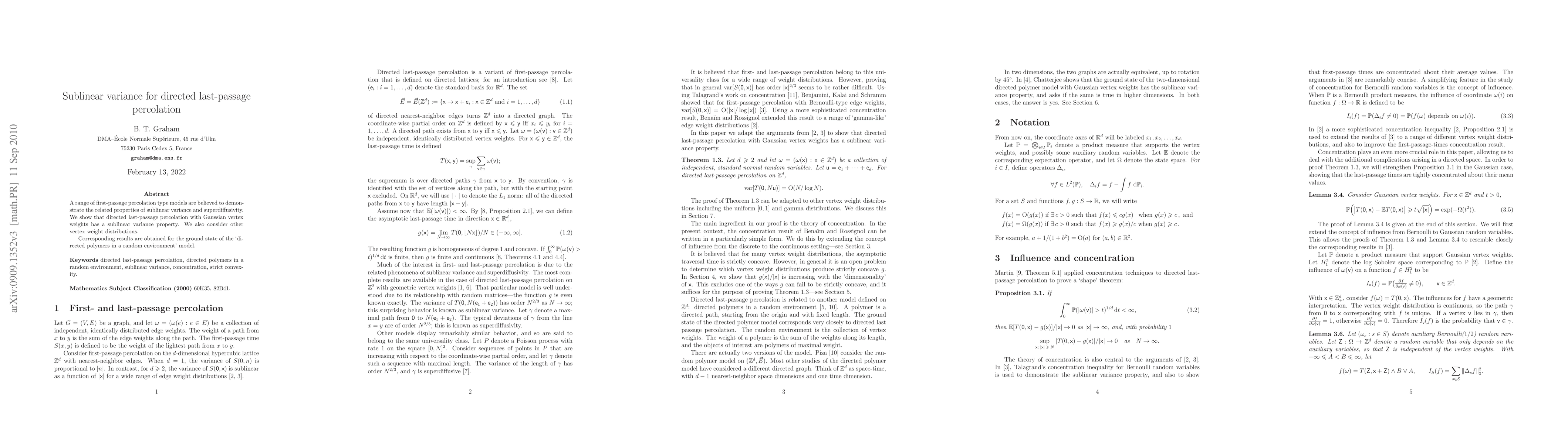 Directed last-passage percolation with Gaussian weights exhibits sublinear variance, highlighting superdiffusive behavior. Similar results are found for other vertex weight distributions, extending to the ground state of the directed polymers model.