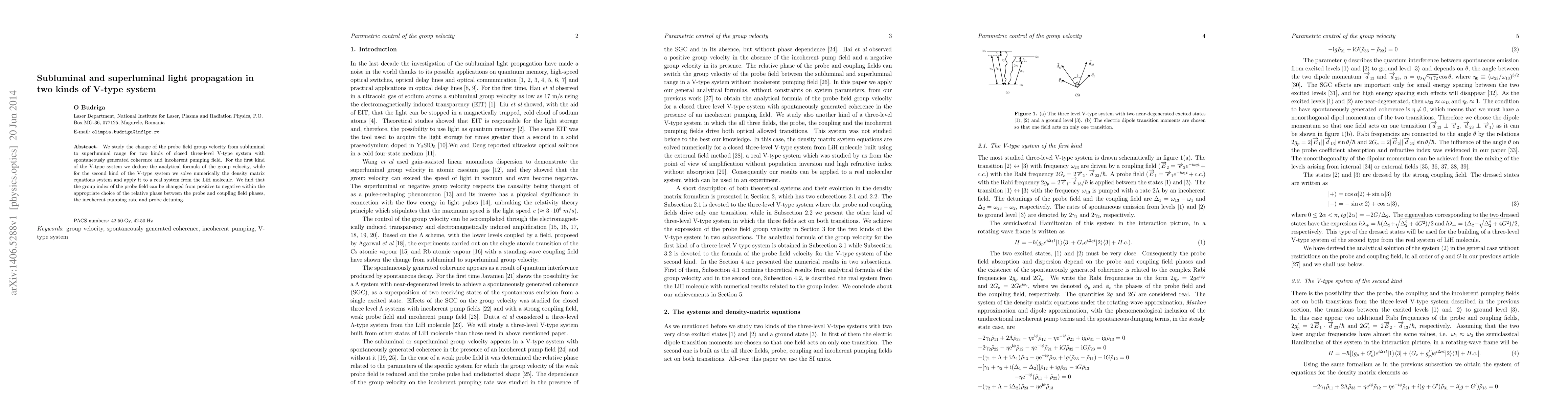We study the change of the probe field group velocity from subluminal to superluminal range for two kinds of closed three-level V-type system with spontaneously generated coherence and incoherent pumping field. For the first kind of the V-type system we deduce the analytical formula of the group velocity, while for the second kind of the V-type system we solve numerically the density matrix equations system and apply it to a real system from the LiH molecule. We find that the group index of the probe field can be changed from positive to negative within the appropriate choice of the relative phase between the probe and coupling field phases, the incoherent pumping rate and probe detuning.