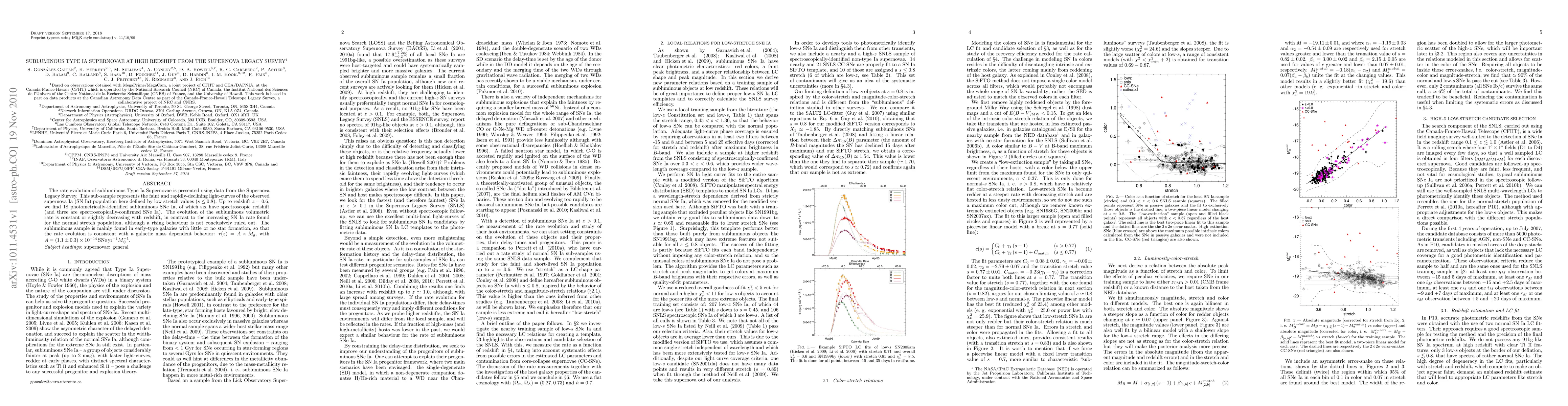 This study investigates the rate evolution of subluminous Type Ia Supernovae (SNe Ia) using data from the Supernova Legacy Survey, finding a constant or slightly decreasing volumetric rate with redshift up to z=0.6. The subluminous SNe Ia predominantly occur in early-type galaxies with minimal star formation, suggesting a galactic mass-dependent rate evolution.