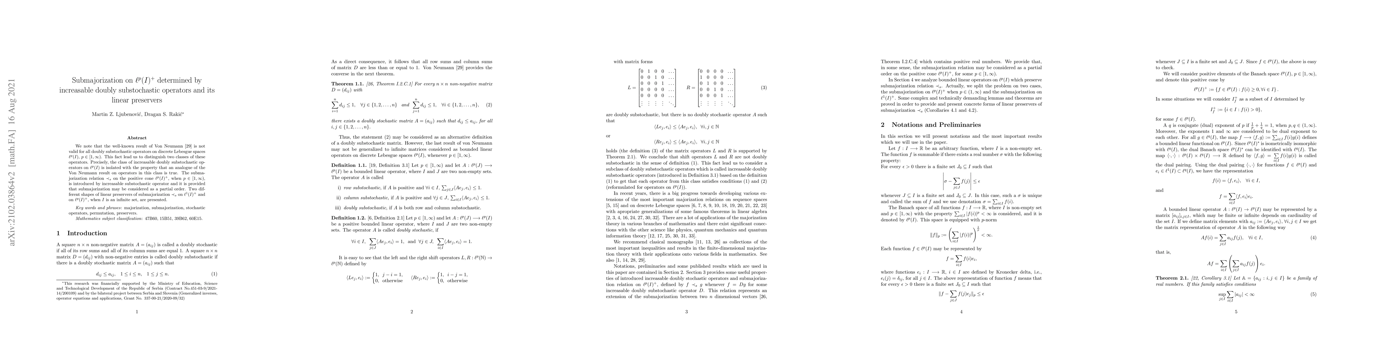 This paper distinguishes increasable doubly substochastic operators on $\ell^p(I)$ that allow an analogue of Von Neumann's result, introducing submajorization $\prec_s$ on $\ell^p(I)^+$. It also presents linear preservers of $\prec_s$ on $\ell^1(I)^+$ and $\ell^p(I)^+$ for infinite sets $I$.