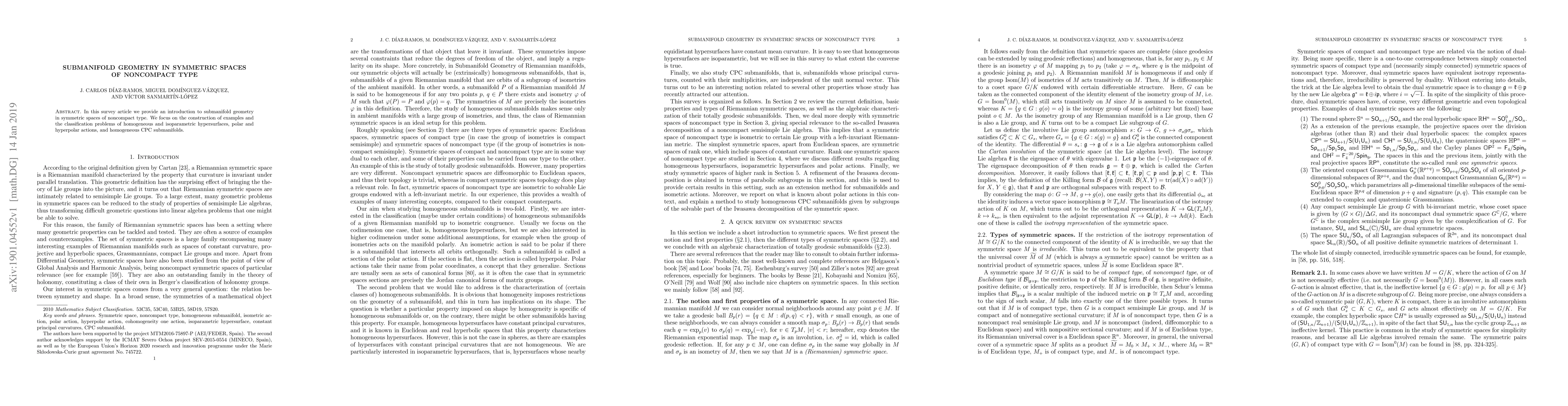 In this survey article we provide an introduction to submanifold geometry in symmetric spaces of noncompact type. We focus on the construction of examples and the classification problems of homogeneous and isoparametric hypersurfaces, polar and hyperpolar actions, and homogeneous CPC submanifolds.