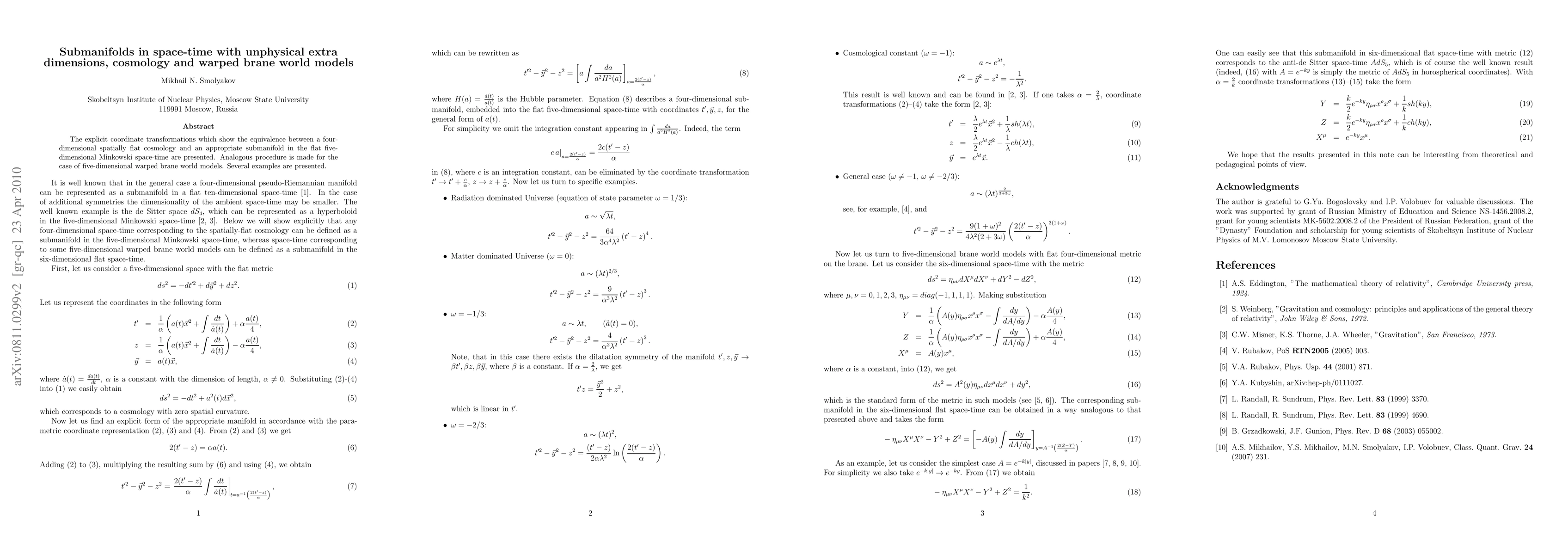 The explicit coordinate transformations which show the equivalence between a four-dimensional spatially flat cosmology and an appropriate submanifold in the flat five-dimensional Minkowski space-time are presented. Analogous procedure is made for the case of five-dimensional warped brane world models. Several examples are presented.