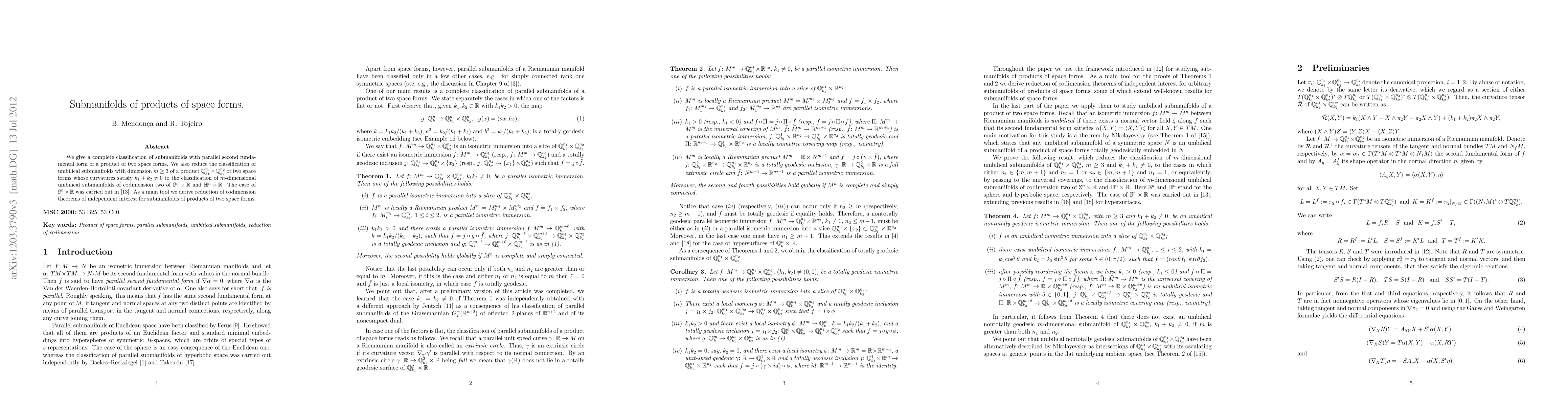 This paper classifies submanifolds with parallel second fundamental form in product spaces of two non-flat space forms, reducing the umbilical submanifold classification to lower dimensions. It also presents reduction of codimension theorems applicable to submanifolds of product space forms.