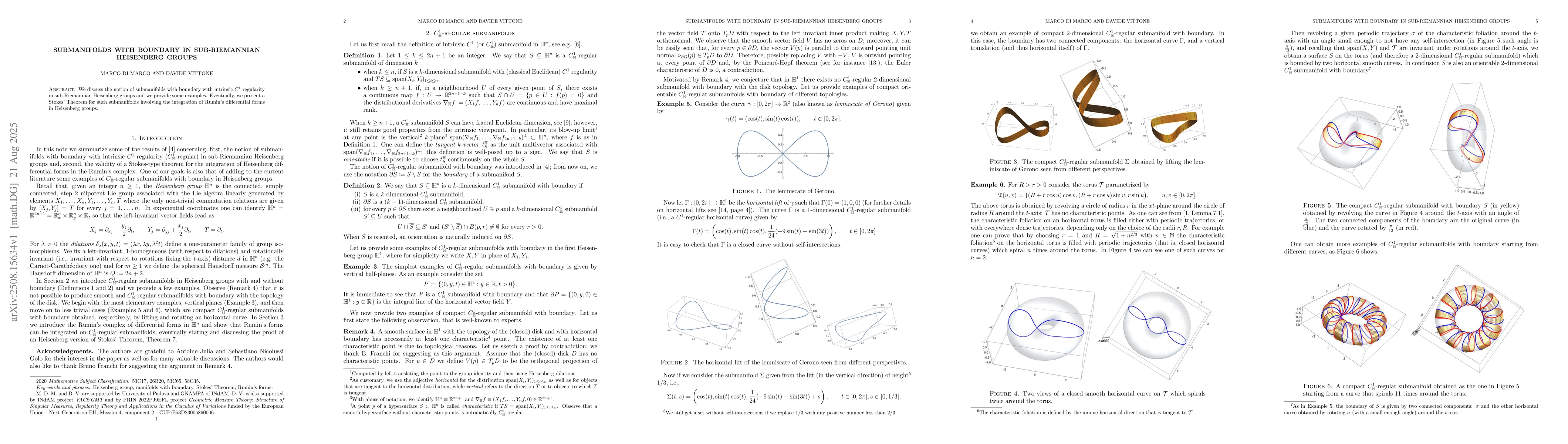 We discuss the notion of submanifolds with boundary with intrinsic $C^1$ regularity in sub-Riemannian Heisenberg groups and we provide some examples. Eventually, we present a Stokes' Theorem for such submanifolds involving the integration of Rumin's differential forms in Heisenberg groups.